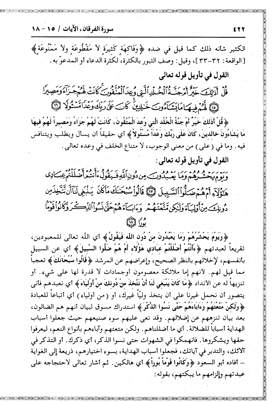 وَيَوْمَ يَحْشُرُهُمْ وَما يَعْبُدُونَ مِنْ دُونِ اللَّهِ فَيَقُولُ أَأَنْتُمْ أَضْلَلْتُمْ عِبادِي هؤُلاءِ أَمْ هُمْ ضَلُّوا السَّبِيلَ (17) قالُوا سُبْحانَكَ ما كانَ يَنْبَغِي لَنا أَنْ نَتَّخِذَ مِنْ دُونِكَ مِنْ أَوْلِياءَ وَلكِنْ مَتَّعْتَهُمْ وَآباءَهُمْ حَتَّى نَسُوا الذِّكْرَ وَكانُوا قَوْماً بُوراً (18)