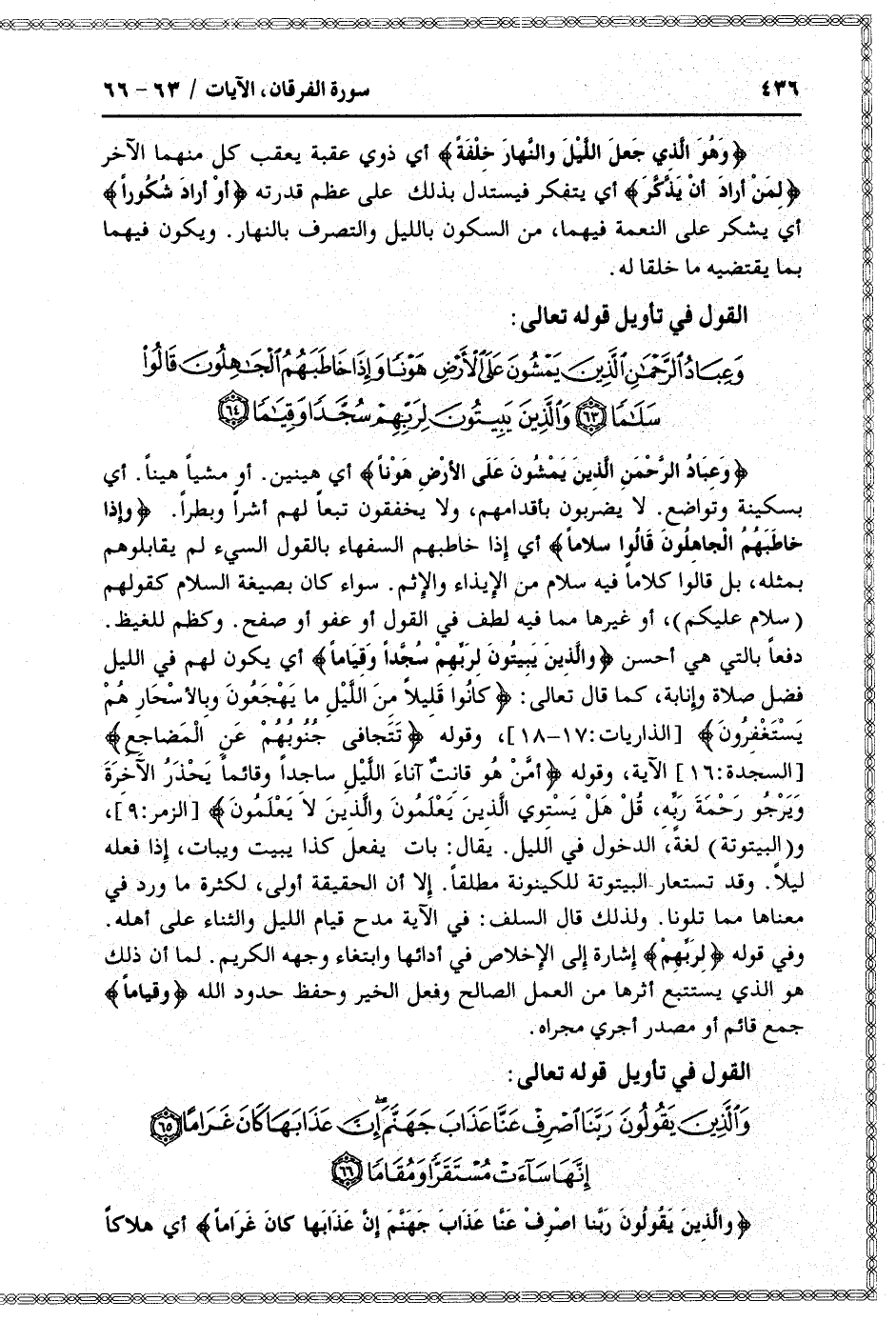 وَعِبادُ الرَّحْمنِ الَّذِينَ يَمْشُونَ عَلَى الْأَرْضِ هَوْناً وَإِذا خاطَبَهُمُ الْجاهِلُونَ قالُوا سَلاماً (63) وَالَّذِينَ يَبِيتُونَ لِرَبِّهِمْ سُجَّداً وَقِياماً (64)