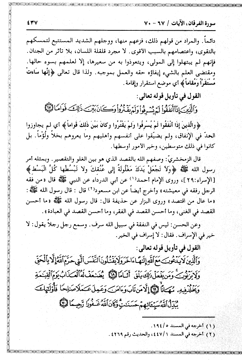 وَالَّذِينَ إِذا أَنْفَقُوا لَمْ يُسْرِفُوا وَلَمْ يَقْتُرُوا وَكانَ بَيْنَ ذلِكَ قَواماً أي لم يجاوزوا الحدّ في الإنفاق، ولم يضيّقوا على أنفسهم وأهليهم وما يعروهم بخلا ولؤما. بل كانوا في ذلك متوسطين، وخير الأمور أوسطها.