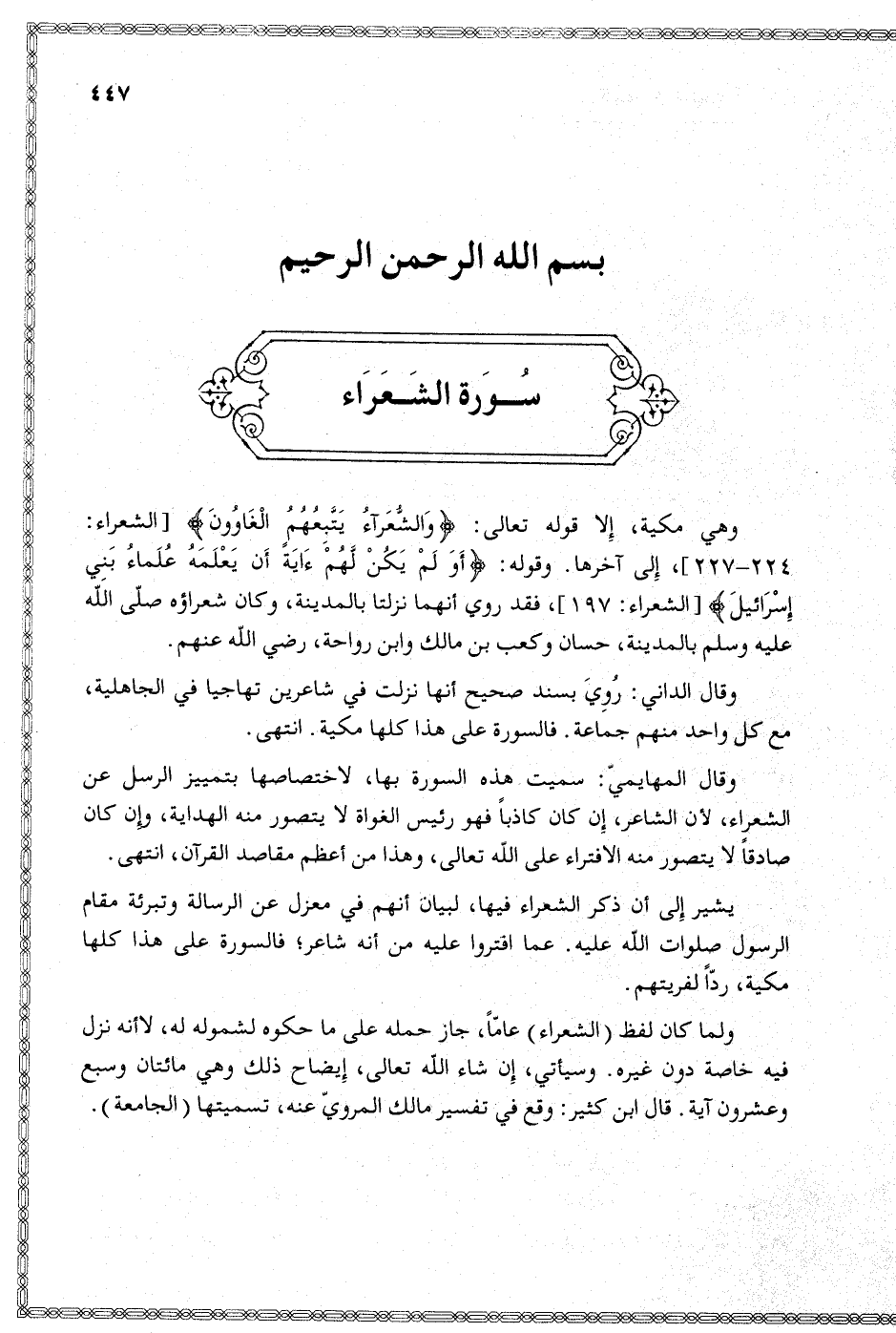 ولما كان لفظ (الشعراء) عامّا، جاز حمله على ما حكوه لشموله له، لا أنه نزل فيه خاصة دون غيره. وسيأتي، إن شاء الله تعالى، إيضاح ذلك وهي مائتان وسبع وعشرون آية. قال ابن كثير: وقع في تفسير مالك المرويّ عنه، تسميتها (الجامعة) .