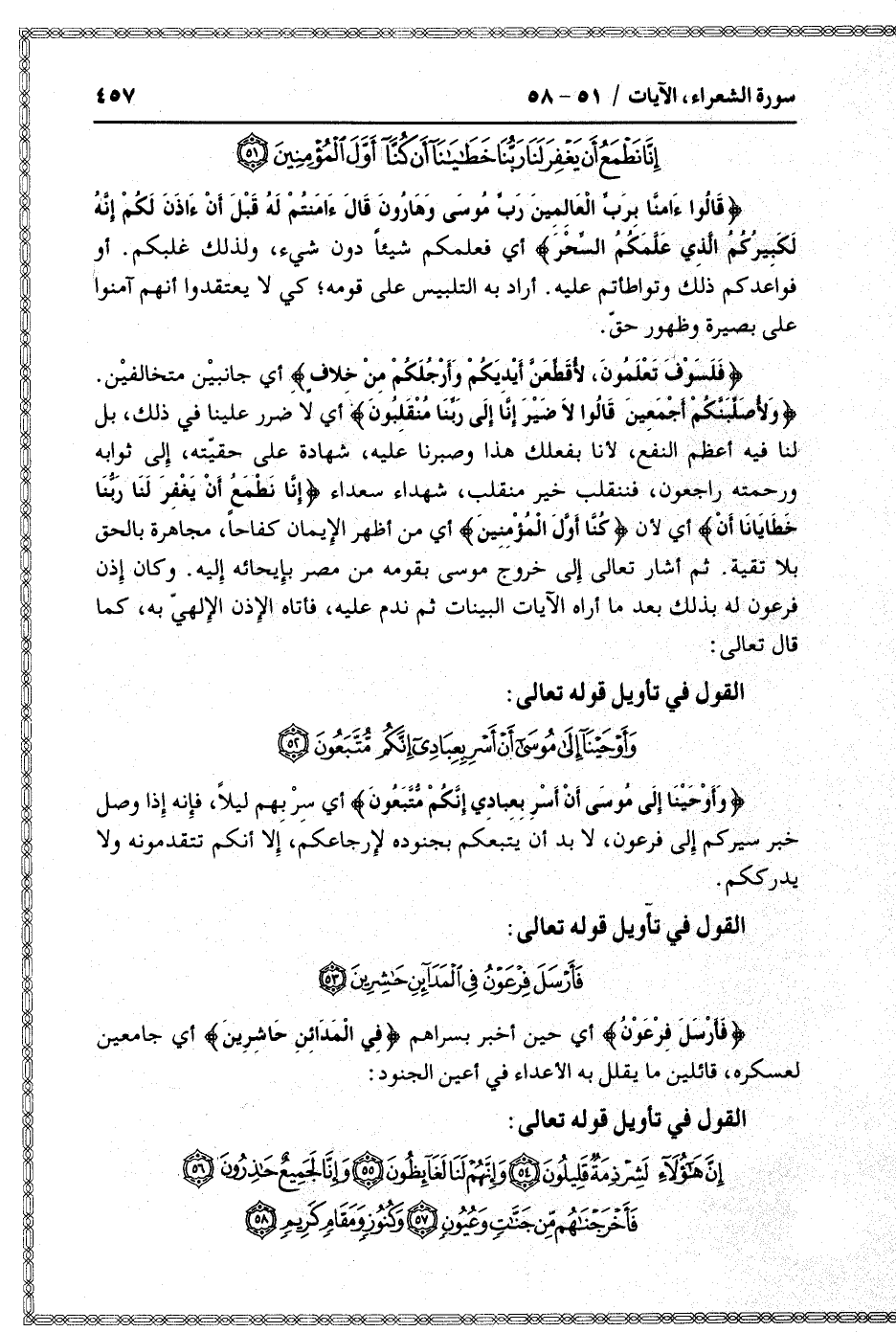 وَلَأُصَلِّبَنَّكُمْ أَجْمَعِينَ قالُوا لا ضَيْرَ إِنَّا إِلى رَبِّنا مُنْقَلِبُونَ أي لا ضرر علينا في ذلك، بل لنا فيه أعظم النفع، لأنا بفعلك هذا وصبرنا عليه، شهادة على حقيّته، إلى ثوابه ورحمته راجعون، فننقلب خير منقلب، شهداء سعداء إِنَّا نَطْمَعُ أَنْ يَغْفِرَ لَنا رَبُّنا خَطايانا أَنْ أي لأن كُنَّا أَوَّلَ الْمُؤْمِنِينَ أي من أظهر الإيمان كفاحا، مجاهرة بالحق بلا تقية. ثم أشار تعالى إلى خروج موسى بقومه من مصر بإيحائه إليه. وكان إذن فرعون له بذلك بعد ما أراه الآيات البينات ثم ندم عليه، فأتاه الإذن الإلهيّ به، كما قال تعالى:
