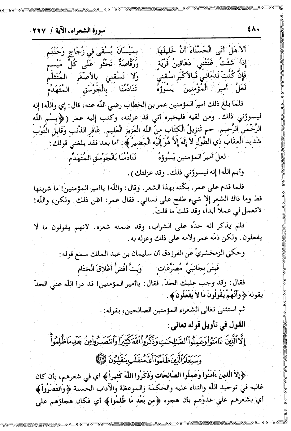 إِلاَّ الَّذِينَ آمَنُوا وَعَمِلُوا الصَّالِحاتِ وَذَكَرُوا اللَّهَ كَثِيراً وَانْتَصَرُوا مِنْ بَعْدِ ما ظُلِمُوا وَسَيَعْلَمُ الَّذِينَ ظَلَمُوا أَيَّ مُنْقَلَبٍ يَنْقَلِبُونَ (227)