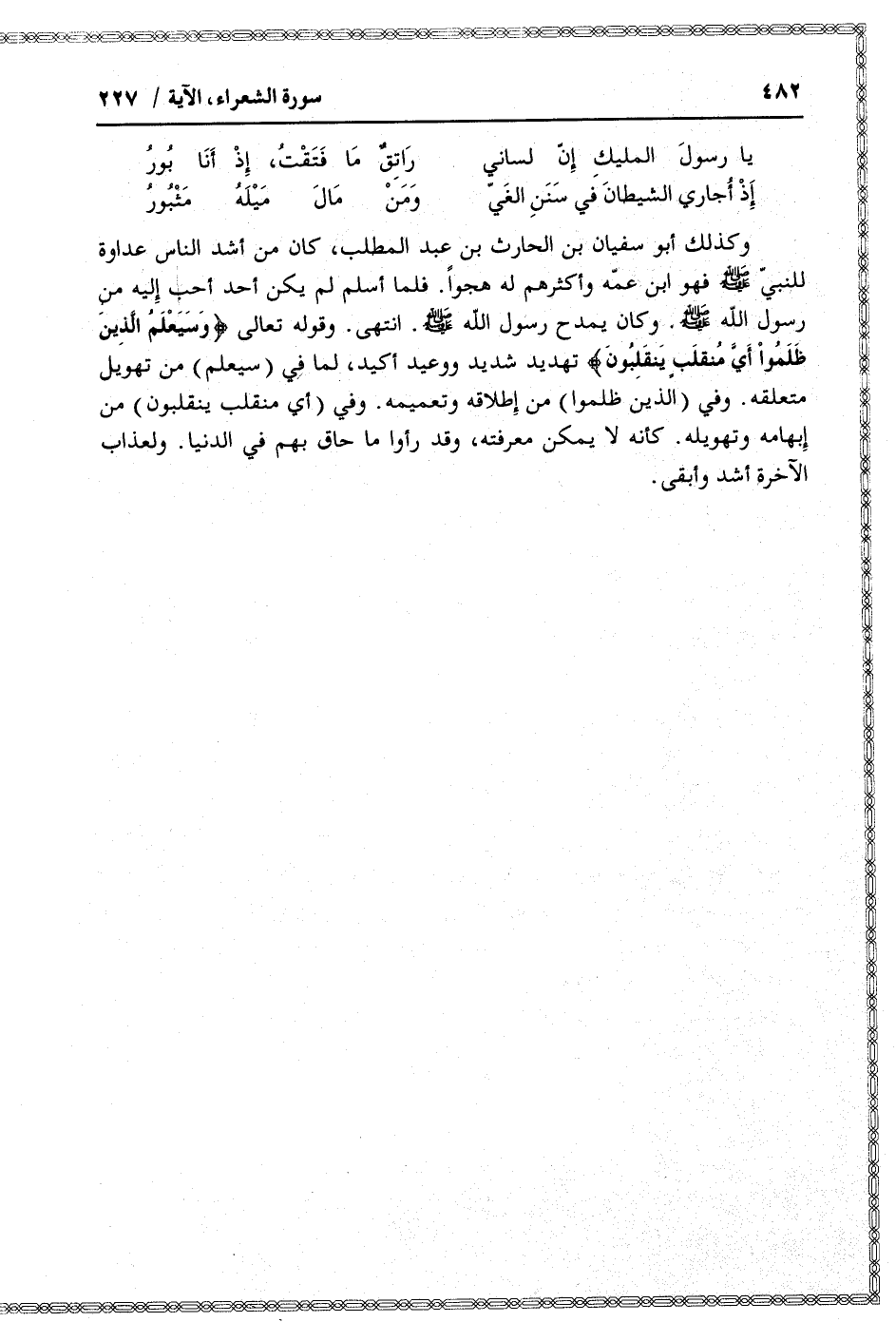 وكذلك أبو سفيان بن الحارث بن عبد المطلب، كان من أشد الناس عداوة للنبيّ صلى الله عليه وسلم فهو ابن عمّه وأكثرهم له هجوا. فلما أسلم لم يكن أحد أحب إليه من رسول الله صلى الله عليه وسلم. وكان يمدح رسول الله صلى الله عليه وسلم. انتهى. وقوله تعالى وَسَيَعْلَمُ الَّذِينَ ظَلَمُوا أَيَّ مُنْقَلَبٍ يَنْقَلِبُونَ تهديد شديد ووعيد أكيد، لما في (سيعلم) من تهويل متعلقه. وفي (الذين ظلموا) من إطلاقه وتعميمه. وفي (أي منقلب ينقلبون) من إبهامه وتهويله. كأنه لا يمكن معرفته، وقد رأوا ما حاق بهم في الدنيا. ولعذاب الآخرة أشد وأبقى.
