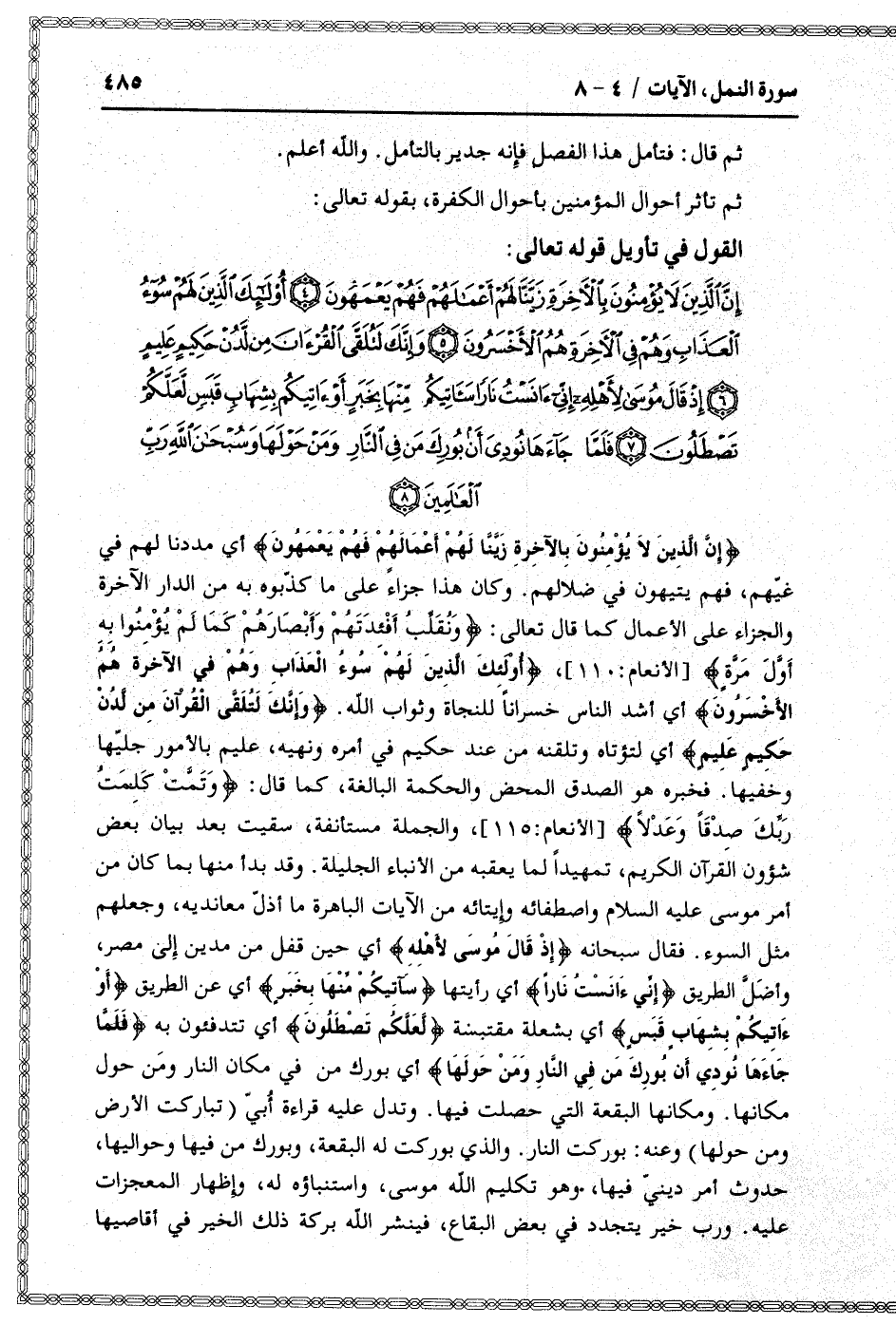 إِنَّ الَّذِينَ لا يُؤْمِنُونَ بِالْآخِرَةِ زَيَّنَّا لَهُمْ أَعْمالَهُمْ فَهُمْ يَعْمَهُونَ (4) أُوْلئِكَ الَّذِينَ لَهُمْ سُوءُ الْعَذابِ وَهُمْ فِي الْآخِرَةِ هُمُ الْأَخْسَرُونَ (5) وَإِنَّكَ لَتُلَقَّى الْقُرْآنَ مِنْ لَدُنْ حَكِيمٍ عَلِيمٍ (6) إِذْ قالَ مُوسى لِأَهْلِهِ إِنِّي آنَسْتُ ناراً سَآتِيكُمْ مِنْها بِخَبَرٍ أَوْ آتِيكُمْ بِشِهابٍ قَبَسٍ لَعَلَّكُمْ تَصْطَلُونَ (7) فَلَمَّا جاءَها نُودِيَ أَنْ بُورِكَ مَنْ فِي النَّارِ وَمَنْ حَوْلَها وَسُبْحانَ اللَّهِ رَبِّ الْعالَمِينَ (8)