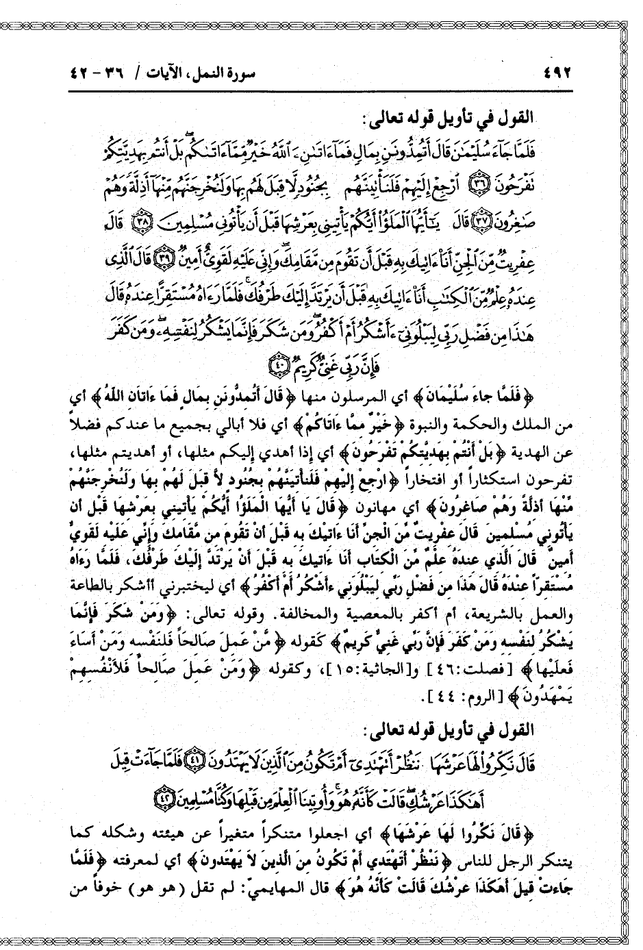 فَلَمَّا جاءَ سُلَيْمانَ أي المرسلون منها قالَ أَتُمِدُّونَنِ بِمالٍ فَما آتانِيَ اللَّهُ أي من الملك والحكمة والنبوة خَيْرٌ مِمَّا آتاكُمْ أي فلا أبالي بجميع ما عندكم فضلا عن الهدية بَلْ أَنْتُمْ بِهَدِيَّتِكُمْ تَفْرَحُونَ أي إذا أهدي إليكم مثلها، أو أهديتم مثلها، تفرحون استكثارا أو افتخارا ارْجِعْ إِلَيْهِمْ فَلَنَأْتِيَنَّهُمْ بِجُنُودٍ لا قِبَلَ لَهُمْ بِها وَلَنُخْرِجَنَّهُمْ مِنْها أَذِلَّةً وَهُمْ صاغِرُونَ أي مهانون قالَ يا أَيُّهَا الْمَلَؤُا أَيُّكُمْ يَأْتِينِي بِعَرْشِها قَبْلَ أَنْ يَأْتُونِي مُسْلِمِينَ قالَ عِفْرِيتٌ مِنَ الْجِنِّ أَنَا آتِيكَ بِهِ قَبْلَ أَنْ تَقُومَ مِنْ مَقامِكَ وَإِنِّي عَلَيْهِ لَقَوِيٌّ أَمِينٌ قالَ الَّذِي عِنْدَهُ عِلْمٌ مِنَ الْكِتابِ أَنَا آتِيكَ بِهِ قَبْلَ أَنْ يَرْتَدَّ إِلَيْكَ طَرْفُكَ، فَلَمَّا رَآهُ مُسْتَقِرًّا عِنْدَهُ قالَ هذا مِنْ فَضْلِ رَبِّي لِيَبْلُوَنِي أَأَشْكُرُ أَمْ أَكْفُرُ أي ليختبرني أأشكر بالطاعة والعمل بالشريعة، أم أكفر بالمعصية والمخالفة. وقوله تعالى: وَمَنْ شَكَرَ فَإِنَّما يَشْكُرُ لِنَفْسِهِ وَمَنْ كَفَرَ فَإِنَّ رَبِّي غَنِيٌّ كَرِيمٌ كقوله مَنْ عَمِلَ صالِحاً فَلِنَفْسِهِ وَمَنْ أَساءَ فَعَلَيْها [فصلت: 46] و [الجاثية: 15] ، وكقوله وَمَنْ عَمِلَ صالِحاً فَلِأَنْفُسِهِمْ يَمْهَدُونَ [الروم: 44] .