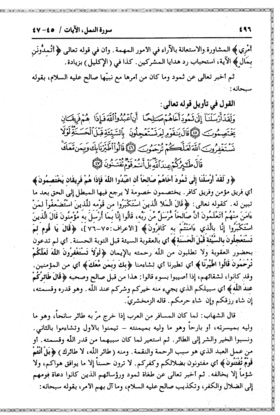 وَلَقَدْ أَرْسَلْنا إِلى ثَمُودَ أَخاهُمْ صالِحاً أَنِ اعْبُدُوا اللَّهَ فَإِذا هُمْ فَرِيقانِ يَخْتَصِمُونَ أي فريق مؤمن وفريق كافر. يختصمون خصومة لا يرجع فيها المبطل إلى الحق بعد ما تبين له. كقوله تعالى: قالَ الْمَلَأُ الَّذِينَ اسْتَكْبَرُوا مِنْ قَوْمِهِ لِلَّذِينَ اسْتُضْعِفُوا لِمَنْ آمَنَ مِنْهُمْ أَتَعْلَمُونَ أَنَّ صالِحاً مُرْسَلٌ مِنْ رَبِّهِ، قالُوا إِنَّا بِما أُرْسِلَ بِهِ مُؤْمِنُونَ قالَ الَّذِينَ اسْتَكْبَرُوا إِنَّا بِالَّذِي آمَنْتُمْ بِهِ كافِرُونَ [الأعراف: 75- 76] ، قالَ يا قَوْمِ لِمَ تَسْتَعْجِلُونَ بِالسَّيِّئَةِ قَبْلَ الْحَسَنَةِ أي بالعقوبة السيئة قبل التوبة الحسنة. أي لم تدعون بحضور العقوبة ولا تطلبون من الله رحمته بالإيمان لَوْلا تَسْتَغْفِرُونَ اللَّهَ لَعَلَّكُمْ تُرْحَمُونَ قالُوا اطَّيَّرْنا أي تطيرنا أي تشاءمنا بِكَ وَبِمَنْ مَعَكَ أي من المؤمنين.