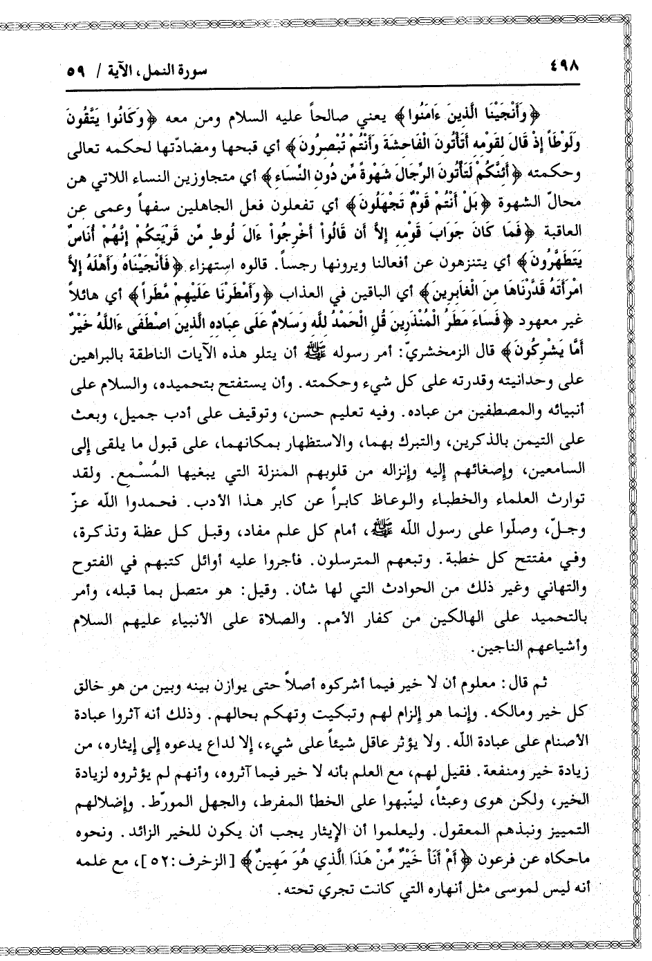 وَأَنْجَيْنَا الَّذِينَ آمَنُوا يعني صالحا عليه السلام ومن معه وَكانُوا يَتَّقُونَ وَلُوطاً إِذْ قالَ لِقَوْمِهِ أَتَأْتُونَ الْفاحِشَةَ وَأَنْتُمْ تُبْصِرُونَ أي قبحها ومضادّتها لحكمه تعالى وحكمته أَإِنَّكُمْ لَتَأْتُونَ الرِّجالَ شَهْوَةً مِنْ دُونِ النِّساءِ أي متجاوزين النساء اللاتي هن محالّ الشهوة بَلْ أَنْتُمْ قَوْمٌ تَجْهَلُونَ أي تفعلون فعل الجاهلين سفها وعمى عن العاقبة فَما كانَ جَوابَ قَوْمِهِ إِلَّا أَنْ قالُوا أَخْرِجُوا آلَ لُوطٍ مِنْ قَرْيَتِكُمْ إِنَّهُمْ أُناسٌ يَتَطَهَّرُونَ أي يتنزهون عن أفعالنا ويرونها رجسا. قالوه استهزاء فَأَنْجَيْناهُ وَأَهْلَهُ إِلَّا امْرَأَتَهُ قَدَّرْناها مِنَ الْغابِرِينَ أي الباقين في العذاب وَأَمْطَرْنا عَلَيْهِمْ مَطَراً أي هائلا غير معهود فَساءَ مَطَرُ الْمُنْذَرِينَ قُلِ الْحَمْدُ لِلَّهِ وَسَلامٌ عَلى عِبادِهِ الَّذِينَ اصْطَفى آللَّهُ خَيْرٌ أَمَّا يُشْرِكُونَ قال الزمخشريّ: أمر رسوله صلى الله عليه وسلم أن يتلو هذه الآيات الناطقة بالبراهين على وحدانيته وقدرته على كل شيء وحكمته. وأن يستفتح بتحميده، والسلام على أنبيائه والمصطفين من عباده. وفيه تعليم حسن، وتوقيف على أدب جميل، وبعث على التيمن بالذكرين، والتبرك بهما، والاستظهار بمكانهما، على قبول ما يلقى إلى السامعين، وإصغائهم إليه وإنزاله من قلوبهم المنزلة التي يبغيها المسمع. ولقد توارث العلماء والخطباء والوعاظ كابرا عن كابر هذا الأدب. فحمدوا الله عزّ وجلّ، وصلّوا على رسول الله صلى الله عليه وسلم، أمام كل علم مفاد، وقبل كل عظة وتذكرة، وفي مفتتح كل خطبة. وتبعهم المترسلون. فأجروا عليه أوائل كتبهم في الفتوح والتهاني وغير ذلك من الحوادث التي لها شأن. وقيل: هو متصل بما قبله، وأمر بالتحميد على الهالكين من كفار الأمم. والصلاة على الأنبياء عليهم السلام وأشياعهم الناجين.