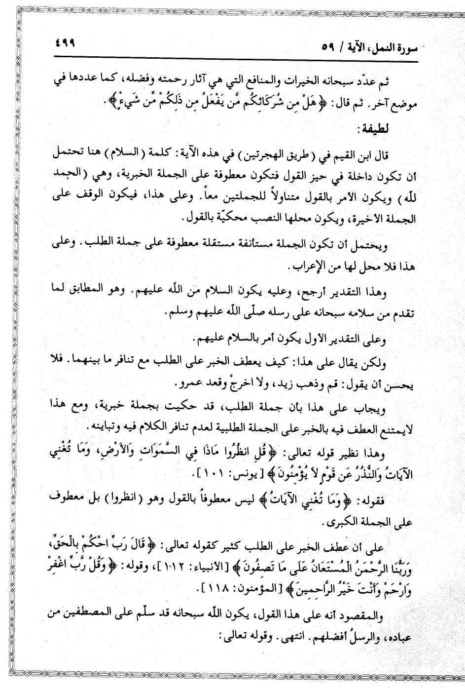 قال ابن القيم في (طريق الهجرتين) في هذه الآية: كلمة (السلام) هنا تحتمل أن تكون داخلة في حيز القول فتكون معطوفة على الجملة الخبرية، وهي (الحمد لله) ويكون الأمر بالقول متناولا للجملتين معا. وعلى هذا، فيكون الوقف على الجملة الأخيرة، ويكون محلها النصب محكيّة بالقول.