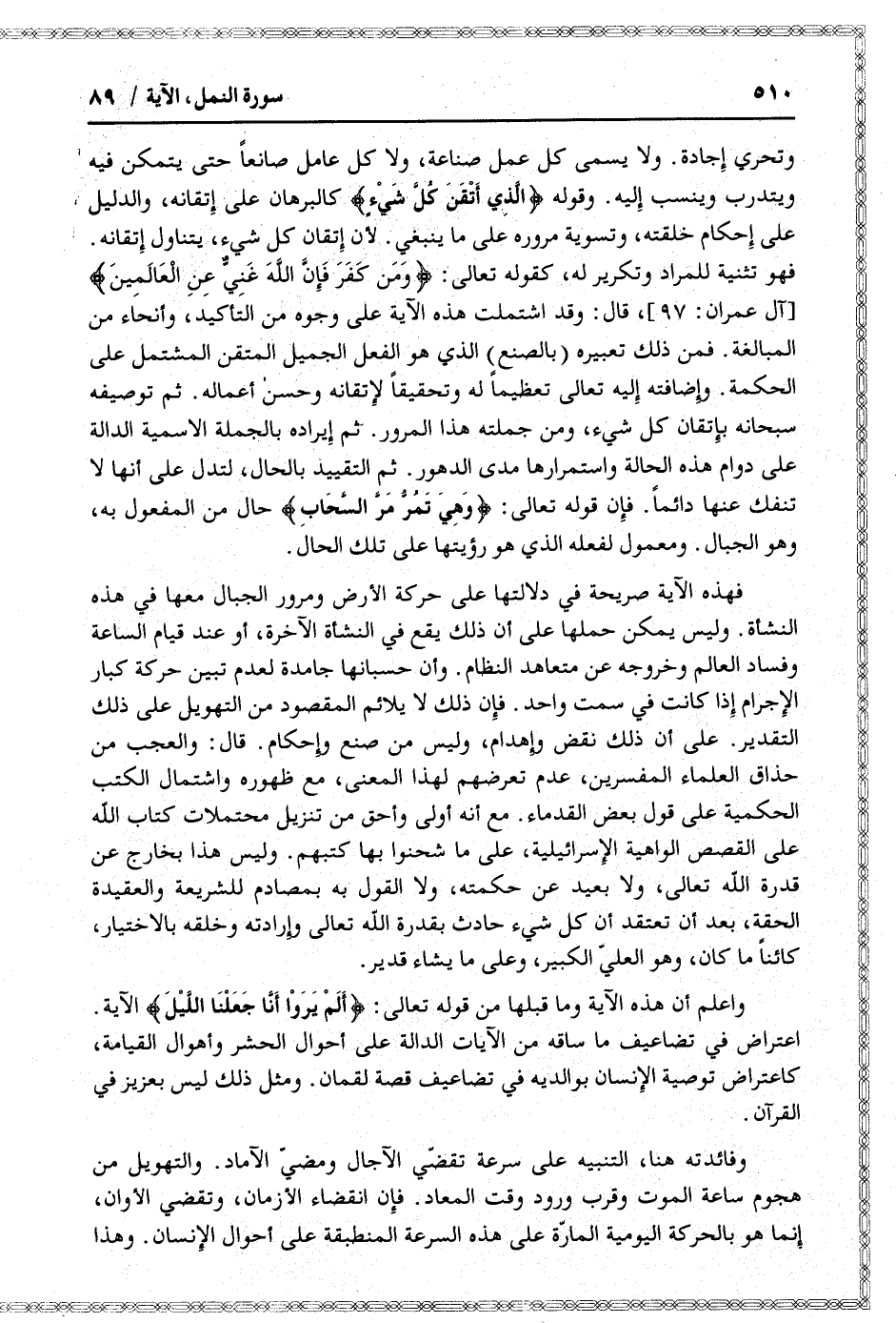 فهذه الآية صريحة في دلالتها على حركة الأرض ومرور الجبال معها في هذه النشأة. وليس يمكن حملها على أن ذلك يقع في النشأة الآخرة، أو عند قيام الساعة وفساد العالم وخروجه عن متعاهد النظام. وأن حسبانها جامدة لعدم تبين حركة كبار الإجرام إذا كانت في سمت واحد. فإن ذلك لا يلائم المقصود من التهويل على ذلك التقدير. على أن ذلك نقض وإهدام، وليس من صنع وإحكام. قال: والعجب من حذاق العلماء المفسرين، عدم تعرضهم لهذا المعنى، مع ظهوره واشتمال الكتب الحكمية على قول بعض القدماء. مع أنه أولى وأحق من تنزيل محتملات كتاب الله على القصص الواهية الإسرائيلية، على ما شحنوا بها كتبهم. وليس هذا بخارج عن قدرة الله تعالى، ولا بعيد عن حكمته، ولا القول به بمصادم للشريعة والعقيدة الحقة، بعد أن تعتقد أن كل شيء حادث بقدرة الله تعالى وإرادته وخلقه بالاختيار، كائنا ما كان، وهو العليّ الكبير، وعلى ما يشاء قدير.