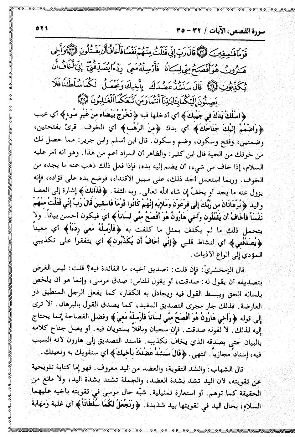 اسْلُكْ يَدَكَ فِي جَيْبِكَ أي أدخلها فيه تَخْرُجْ بَيْضاءَ مِنْ غَيْرِ سُوءٍ أي عيب وَاضْمُمْ إِلَيْكَ جَناحَكَ أي يدك مِنَ الرَّهْبِ أي الخوف. قرئ بفتحتين، وضمتين، وفتح وسكون، وضم وسكون. قال ابن أسلم وابن جرير: مما حصل لك من خوفك من الحية قال ابن كثير: والظاهر أن المراد أعم من هذا. وهو أنه أمر عليه السلام، إذا خاف من شيء، أن يضم إليه يده، فإذا فعل ذلك ذهب عنه ما يجده من الخوف. وربما استعمل أحد ذلك، على سبيل الاقتداء، فوضع يده على فؤاده، فإنه يزول عنه ما يجد أو يخفّ إن شاء الله تعالى. وبه الثقة. فَذانِكَ إشارة إلى العصا واليد بُرْهانانِ مِنْ رَبِّكَ إِلى فِرْعَوْنَ وَمَلَائِهِ إِنَّهُمْ كانُوا قَوْماً فاسِقِينَ قالَ رَبِّ إِنِّي قَتَلْتُ مِنْهُمْ نَفْساً فَأَخافُ أَنْ يَقْتُلُونِ وَأَخِي هارُونُ هُوَ أَفْصَحُ مِنِّي لِساناً أي فيكون أحسن بيانا. ولا يتحمل ذلك ما لم يكلف بمثل ما كلفت به فَأَرْسِلْهُ مَعِي رِدْءاً أي معينا يُصَدِّقُنِي أي لنشاط قلبي إِنِّي أَخافُ أَنْ يُكَذِّبُونِ أي يتفقوا على تكذيبي المؤدي إلى أنواع الأذيات.