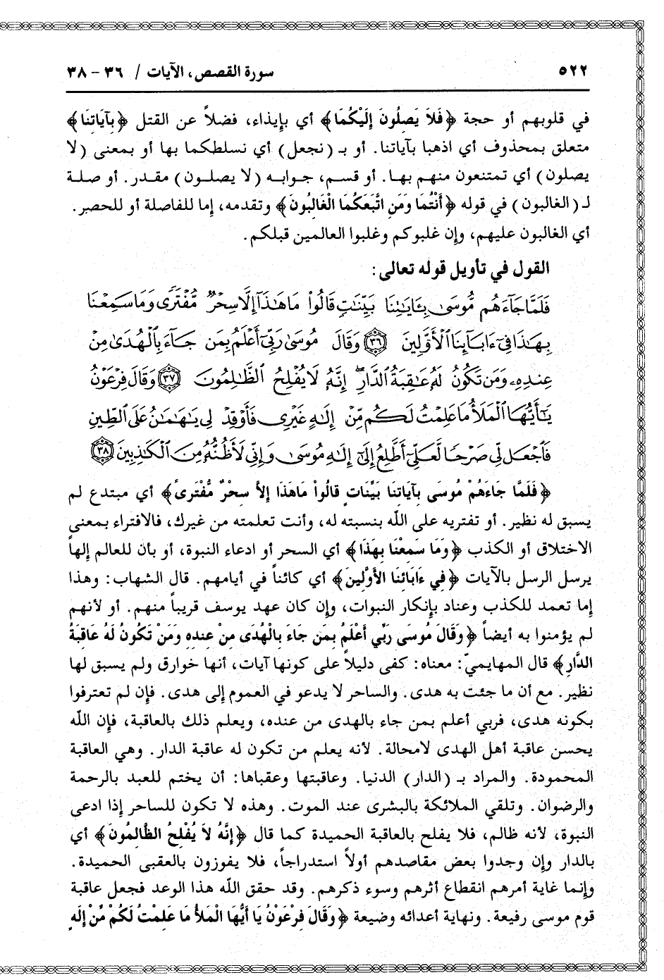 فَلَمَّا جاءَهُمْ مُوسى بِآياتِنا بَيِّناتٍ قالُوا ما هذا إِلاَّ سِحْرٌ مُفْتَرىً وَما سَمِعْنا بِهذا فِي آبائِنَا الْأَوَّلِينَ (36) وَقالَ مُوسى رَبِّي أَعْلَمُ بِمَنْ جاءَ بِالْهُدى مِنْ عِنْدِهِ وَمَنْ تَكُونُ لَهُ عاقِبَةُ الدَّارِ إِنَّهُ لا يُفْلِحُ الظَّالِمُونَ (37) وَقالَ فِرْعَوْنُ يا أَيُّهَا الْمَلَأُ ما عَلِمْتُ لَكُمْ مِنْ إِلهٍ غَيْرِي فَأَوْقِدْ لِي يا هامانُ عَلَى الطِّينِ فَاجْعَلْ لِي صَرْحاً لَعَلِّي أَطَّلِعُ إِلى إِلهِ مُوسى وَإِنِّي لَأَظُنُّهُ مِنَ الْكاذِبِينَ (38)