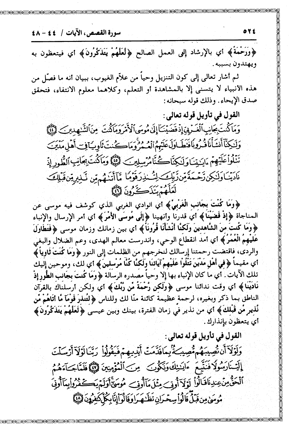 وَما كُنْتَ بِجانِبِ الْغَرْبِيِّ إِذْ قَضَيْنا إِلى مُوسَى الْأَمْرَ وَما كُنْتَ مِنَ الشَّاهِدِينَ (44) وَلكِنَّا أَنْشَأْنا قُرُوناً فَتَطاوَلَ عَلَيْهِمُ الْعُمُرُ وَما كُنْتَ ثاوِياً فِي أَهْلِ مَدْيَنَ تَتْلُوا عَلَيْهِمْ آياتِنا وَلكِنَّا كُنَّا مُرْسِلِينَ (45) وَما كُنْتَ بِجانِبِ الطُّورِ إِذْ نادَيْنا وَلكِنْ رَحْمَةً مِنْ رَبِّكَ لِتُنْذِرَ قَوْماً ما أَتاهُمْ مِنْ نَذِيرٍ مِنْ قَبْلِكَ لَعَلَّهُمْ يَتَذَكَّرُونَ (46)
