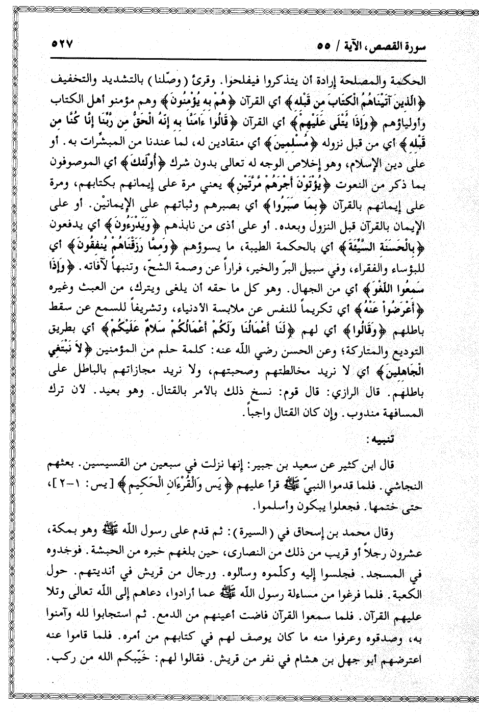 وقال محمد بن إسحاق في (السيرة) : ثم قدم على رسول الله صلى الله عليه وسلم وهو بمكة، عشرون رجلا أو قريب من ذلك من النصارى، حين بلغهم خبره من الحبشة. فوجدوه في المسجد. فجلسوا إليه وكلّموه وسألوه. ورجال من قريش في أنديتهم. حول الكعبة. فلما فرغوا من مساءلة رسول الله صلى الله عليه وسلم عما أرادوا، دعاهم إلى الله تعالى وتلا عليهم القرآن. فلما سمعوا القرآن فاضت أعينهم من الدمع. ثم استجابوا لله وآمنوا به، وصدقوه وعرفوا منه ما كان يوصف لهم في كتابهم من أمره. فلما قاموا عنه اعترضهم أبو جهل بن هشام في نفر من قريش. فقالوا لهم: خيّبكم الله من ركب.