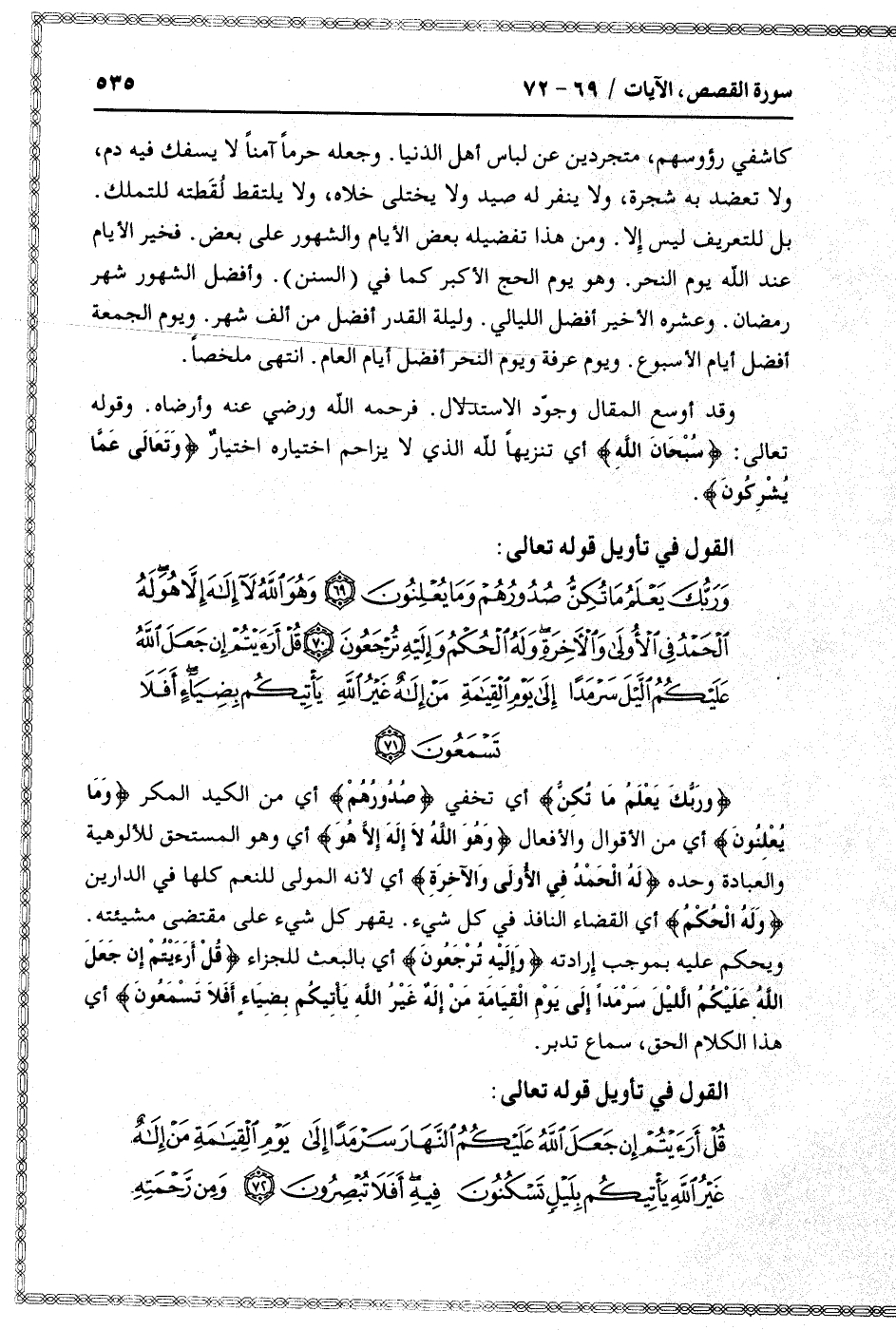 وَرَبُّكَ يَعْلَمُ ما تُكِنُّ صُدُورُهُمْ وَما يُعْلِنُونَ (69) وَهُوَ اللَّهُ لا إِلهَ إِلاَّ هُوَ لَهُ الْحَمْدُ فِي الْأُولى وَالْآخِرَةِ وَلَهُ الْحُكْمُ وَإِلَيْهِ تُرْجَعُونَ (70) قُلْ أَرَأَيْتُمْ إِنْ جَعَلَ اللَّهُ عَلَيْكُمُ اللَّيْلَ سَرْمَداً إِلى يَوْمِ الْقِيامَةِ مَنْ إِلهٌ غَيْرُ اللَّهِ يَأْتِيكُمْ بِضِياءٍ أَفَلا تَسْمَعُونَ (71)
