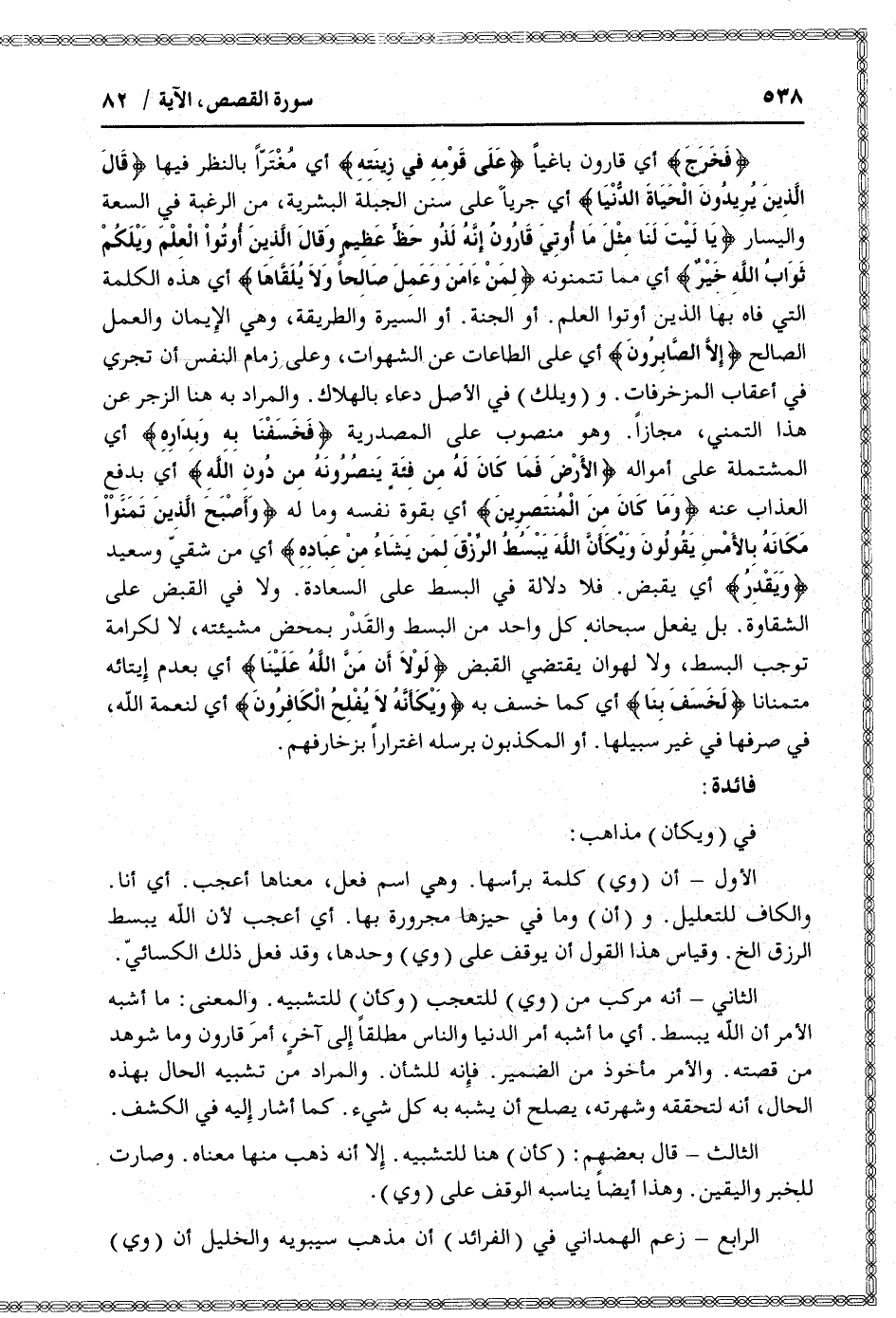 فَخَرَجَ أي قارون باغيا عَلى قَوْمِهِ فِي زِينَتِهِ أي مغترّا بالنظر فيها قالَ الَّذِينَ يُرِيدُونَ الْحَياةَ الدُّنْيا أي جريا على سنن الجبلة البشرية، من الرغبة في السعة واليسار يا لَيْتَ لَنا مِثْلَ ما أُوتِيَ قارُونُ إِنَّهُ لَذُو حَظٍّ عَظِيمٍ وَقالَ الَّذِينَ أُوتُوا الْعِلْمَ وَيْلَكُمْ ثَوابُ اللَّهِ خَيْرٌ أي مما تتمنونه لِمَنْ آمَنَ وَعَمِلَ صالِحاً وَلا يُلَقَّاها أي هذه الكلمة التي فاه بها الذين أوتوا العلم. أو الجنة. أو السيرة والطريقة، وهي الإيمان والعمل الصالح إِلَّا الصَّابِرُونَ أي على الطاعات عن الشهوات، وعلى زمام النفس أن تجري في أعقاب المزخرفات. و (ويلك) في الأصل دعاء بالهلاك. والمراد به هنا الزجر عن هذا التمني، مجازا. وهو منصوب على المصدرية فَخَسَفْنا بِهِ وَبِدارِهِ أي المشتملة على أمواله الْأَرْضَ فَما كانَ لَهُ مِنْ فِئَةٍ يَنْصُرُونَهُ مِنْ دُونِ اللَّهِ أي بدفع العذاب عنه وَما كانَ مِنَ المُنْتَصِرِينَ أي بقوة نفسه وما له وَأَصْبَحَ الَّذِينَ تَمَنَّوْا مَكانَهُ بِالْأَمْسِ يَقُولُونَ وَيْكَأَنَّ اللَّهَ يَبْسُطُ الرِّزْقَ لِمَنْ يَشاءُ مِنْ عِبادِهِ أي من شقيّ وسعيد وَيَقْدِرُ أي يقبض. فلا دلالة في البسط على السعادة. ولا في القبض على الشقاوة. بل يفعل سبحانه كل واحد من البسط والقدر بمحض مشيئته، لا لكرامة توجب البسط، ولا لهوان يقتضي القبض لَوْلا أَنْ مَنَّ اللَّهُ عَلَيْنا أي بعدم إيتائه متمنانا لَخَسَفَ بِنا أي كما خسف به وَيْكَأَنَّهُ لا يُفْلِحُ الْكافِرُونَ أي بعدم إيتائه متمنانا لَخَسَفَ بِنا أي كما خسف به وَيْكَأَنَّهُ لا يُفْلِحُ الْكافِرُونَ أي لنعمة الله، في صرفها في غير سبيلها. أو المكذبون برسله اغترارا بزخارفهم.