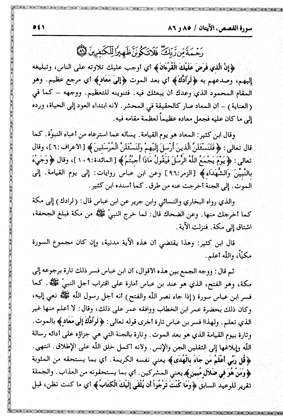 ثم قال: ووجه الجمع بين هذه الأقوال، أن ابن عباس فسر ذلك تارة برجوعه إلى مكة، وهو الفتح، الذي هو عند بن عباس أمارة على اقتراب أجل النبيّ صلى الله عليه وسلم. كما فسر ابن عباس سورة (إذا جاء نصر الله والفتح) أنه أجل رسول الله صلى الله عليه وسلم نعي إليه، وكان ذلك بحضرة عمر ابن الخطاب ووافقه عمر على ذلك، وقال: لا أعلم منها غير الذي تعلم. ولهذا فسر بن عباس تارة أخرى قوله تعالى: لَرادُّكَ إِلى مَعادٍ بالموت.