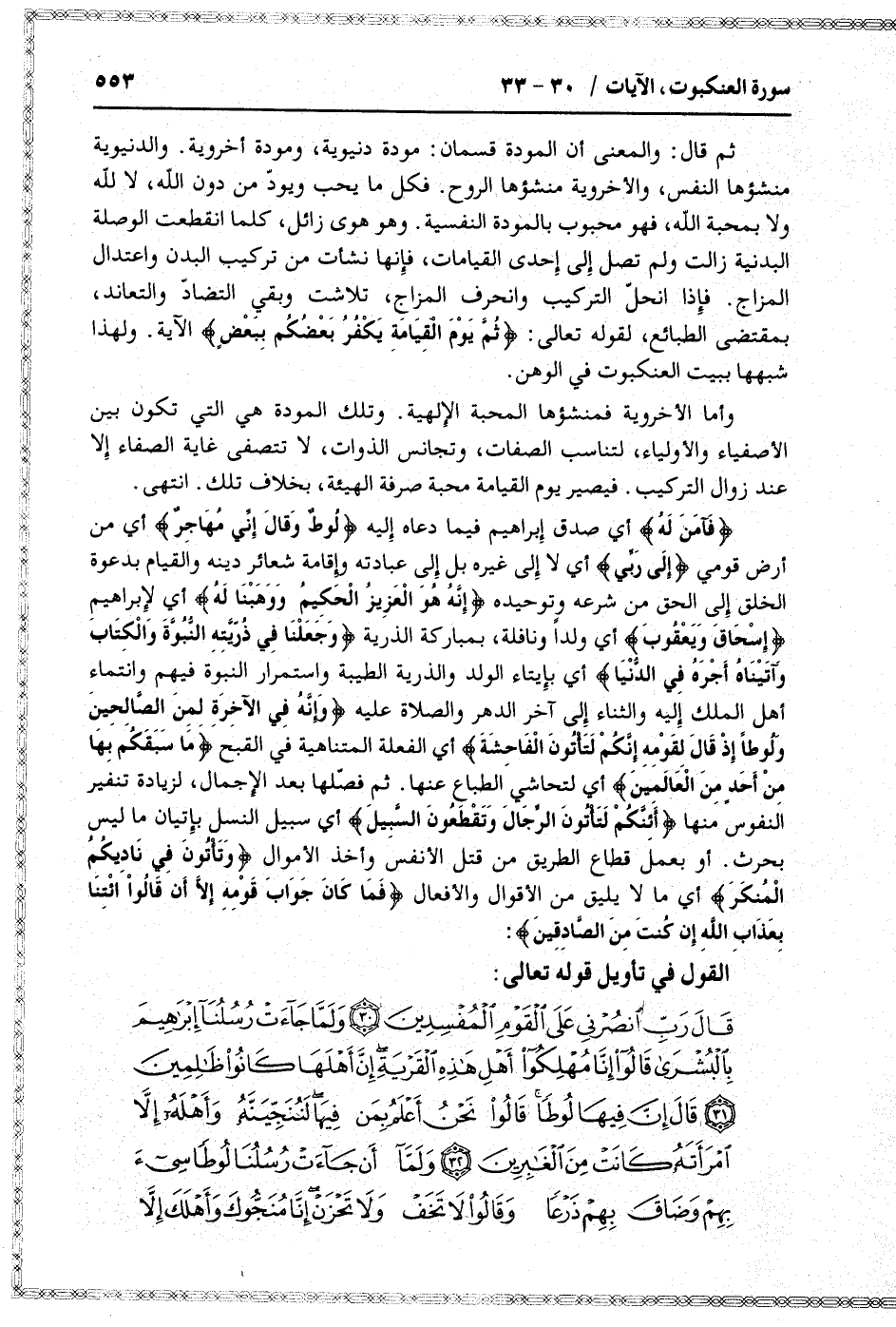 ثم قال: والمعنى أن المودة قسمان: مودة دنيوية، ومودة أخروية. والدنيوية منشؤها النفس، والأخروية منشؤها الروح. فكل ما يحب ويودّ من دون الله، لا لله ولا بمحبة الله، فهو محبوب بالمودة النفسية. وهو هوى زائل، كلما انقطعت الوصلة البدنية زالت ولم تصل إلى إحدى القيامات، فإنها نشأت من تركيب البدن واعتدال المزاج. فإذا انحلّ التركيب وانحرف المزاج، تلاشت وبقي التضادّ والتعاند، بمقتضى الطبائع، لقوله تعالى: ثُمَّ يَوْمَ الْقِيامَةِ يَكْفُرُ بَعْضُكُمْ بِبَعْضٍ الآية. ولهذا شبهها ببيت العنكبوت في الوهن.