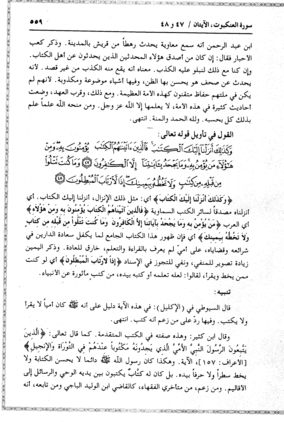 وَكَذلِكَ أَنْزَلْنا إِلَيْكَ الْكِتابَ فَالَّذِينَ آتَيْناهُمُ الْكِتابَ يُؤْمِنُونَ بِهِ وَمِنْ هؤُلاءِ مَنْ يُؤْمِنُ بِهِ وَما يَجْحَدُ بِآياتِنا إِلاَّ الْكافِرُونَ (47) وَما كُنْتَ تَتْلُوا مِنْ قَبْلِهِ مِنْ كِتابٍ وَلا تَخُطُّهُ بِيَمِينِكَ إِذاً لارْتابَ الْمُبْطِلُونَ (48)