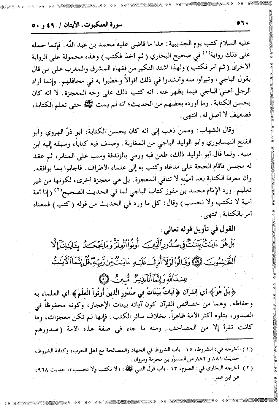 وقال الشهاب: وممن ذهب إلى أنه كان يحسن الكتابة، أبو ذرّ الهروي وأبو الفتح النيسابوري وأبو الوليد الباجي من المغاربة. وصنف فيه كتابا، وسبقه إليه ابن منبه. ولما قال أبو الوليد ذلك، طعن فيه ورمي بالزندقة وسب على المنابر، ثم عقد له مجلس فأقام الحجة على مدعاه وكتب به إلى علماء الأطراف. فأجابوا بما يوافقه.