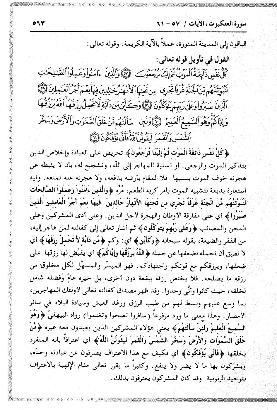 كُلُّ نَفْسٍ ذائِقَةُ الْمَوْتِ ثُمَّ إِلَيْنا تُرْجَعُونَ (57) وَالَّذِينَ آمَنُوا وَعَمِلُوا الصَّالِحاتِ لَنُبَوِّئَنَّهُمْ مِنَ الْجَنَّةِ غُرَفاً تَجْرِي مِنْ تَحْتِهَا الْأَنْهارُ خالِدِينَ فِيها نِعْمَ أَجْرُ الْعامِلِينَ (58) الَّذِينَ صَبَرُوا وَعَلى رَبِّهِمْ يَتَوَكَّلُونَ (59) وَكَأَيِّنْ مِنْ دَابَّةٍ لا تَحْمِلُ رِزْقَهَا اللَّهُ يَرْزُقُها وَإِيَّاكُمْ وَهُوَ السَّمِيعُ الْعَلِيمُ (60) وَلَئِنْ سَأَلْتَهُمْ مَنْ خَلَقَ السَّماواتِ وَالْأَرْضَ وَسَخَّرَ الشَّمْسَ وَالْقَمَرَ لَيَقُولُنَّ اللَّهُ فَأَنَّى يُؤْفَكُونَ (61)