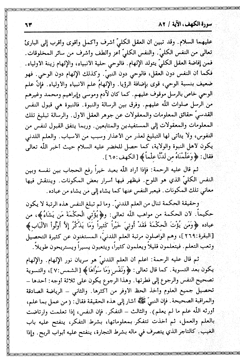 ثم قال عليه الرحمة: اعلم أن العلم اللدنيّ هو سريان نور الإلهام. والإلهام يكون بعد التسوية. كما قال تعالى: وَنَفْسٍ وَما سَوَّاها [الشمس: 7] ، والتسوية تصحيح النفس والرجوع إلى فطرتها. وهذا الرجوع يكون على ثلاثة أوجه: أحدها- تحصيل جميع العلوم وأخذ الحظ الأوفر من أكثرها. والثاني- الرياضة الصادقة والمراقبة الصحيحة. فإن النبيّ صلى الله عليه وسلم أشار إلى هذه الحقيقة