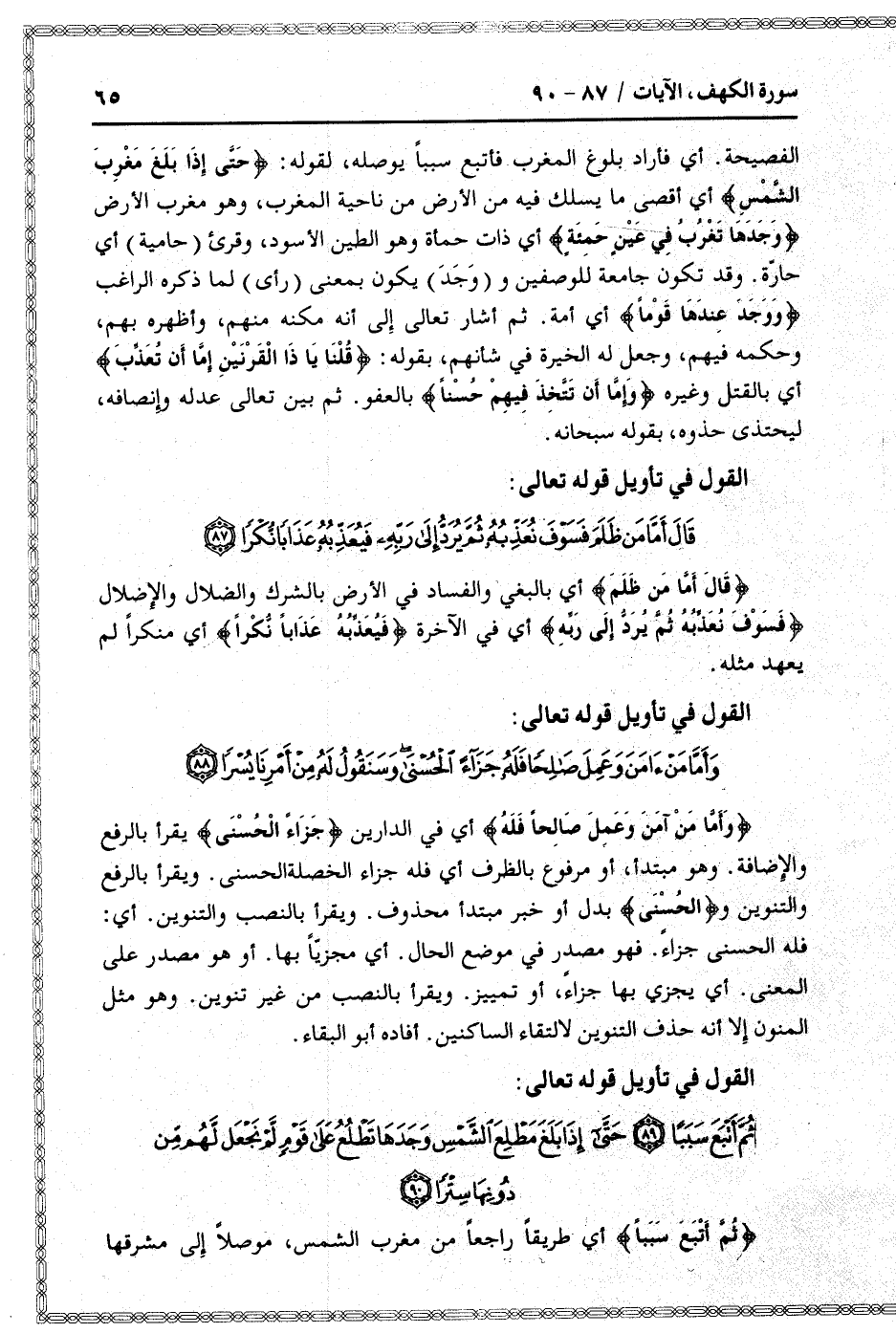 الفصيحة. أي فأراد بلوغ المغرب فأتبع سببا يوصله، لقوله: حَتَّى إِذا بَلَغَ مَغْرِبَ الشَّمْسِ أي أقصى ما يسلك فيه من الأرض من ناحية المغرب، وهو مغرب الأرض وَجَدَها تَغْرُبُ فِي عَيْنٍ حَمِئَةٍ أي ذات حمأة وهو الطين الأسود، وقرئ (حامية) أي حارّة. وقد تكون جامعة للوصفين و (وجد) يكون بمعنى (رأى) لما ذكره الراغب وَوَجَدَ عِنْدَها قَوْماً أي أمة. ثم أشار تعالى إلى أنه مكنه منهم، وأظهره بهم، وحكمه فيهم، وجعل له الخيرة في شأنهم، بقوله: قُلْنا يا ذَا الْقَرْنَيْنِ إِمَّا أَنْ تُعَذِّبَ أي بالقتل وغيره وَإِمَّا أَنْ تَتَّخِذَ فِيهِمْ حُسْناً بالعفو. ثم بين تعالى عدله وإنصافه، ليحتذى حذوه، بقوله سبحانه.