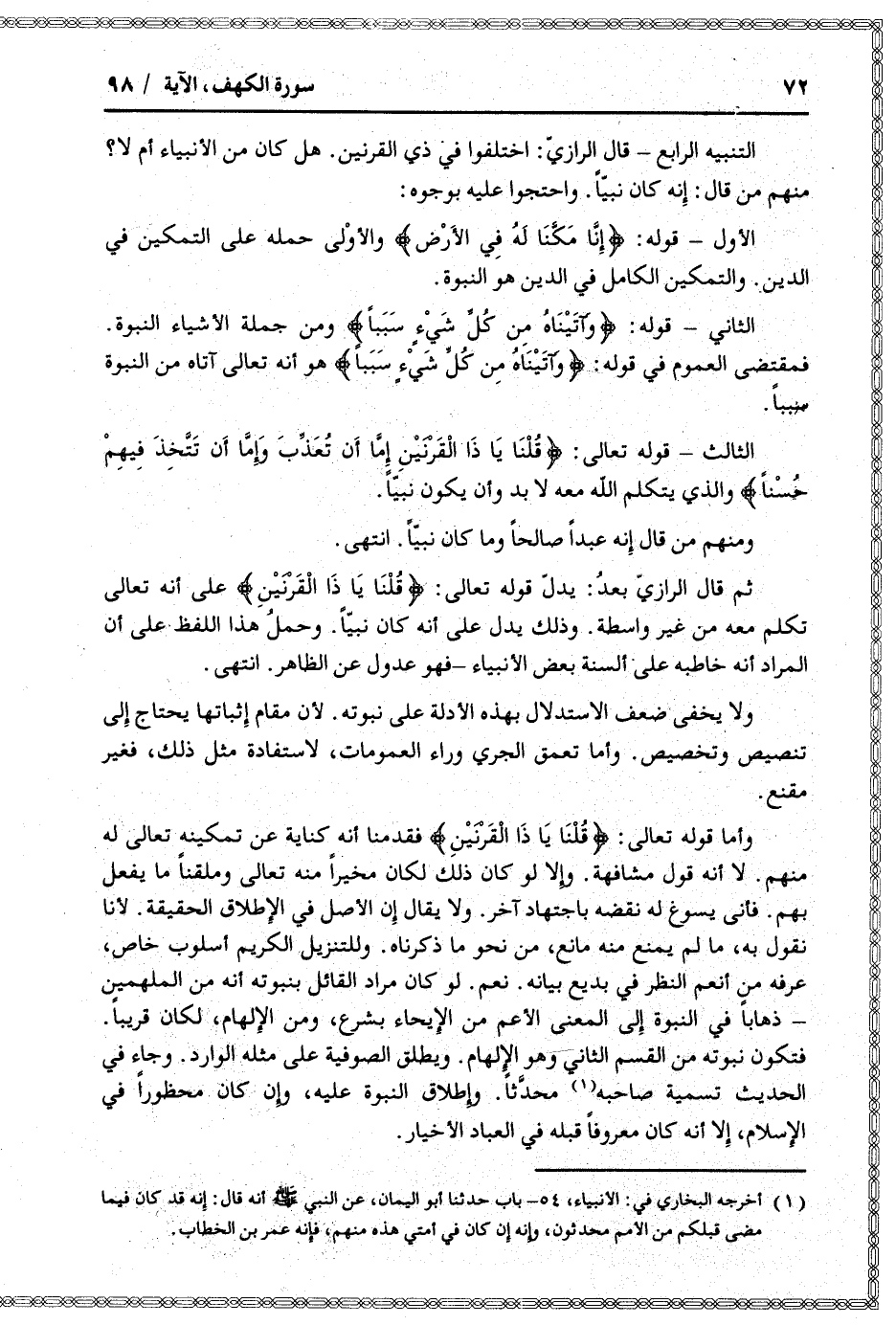 ثم قال الرازيّ بعد: يدلّ قوله تعالى: قُلْنا يا ذَا الْقَرْنَيْنِ على أنه تعالى تكلم معه من غير واسطة. وذلك يدل على أنه كان نبيّا. وحمل هذا اللفظ على أن المراد أنه خاطبه على ألسنة بعض الأنبياء- فهو عدول عن الظاهر. انتهى.