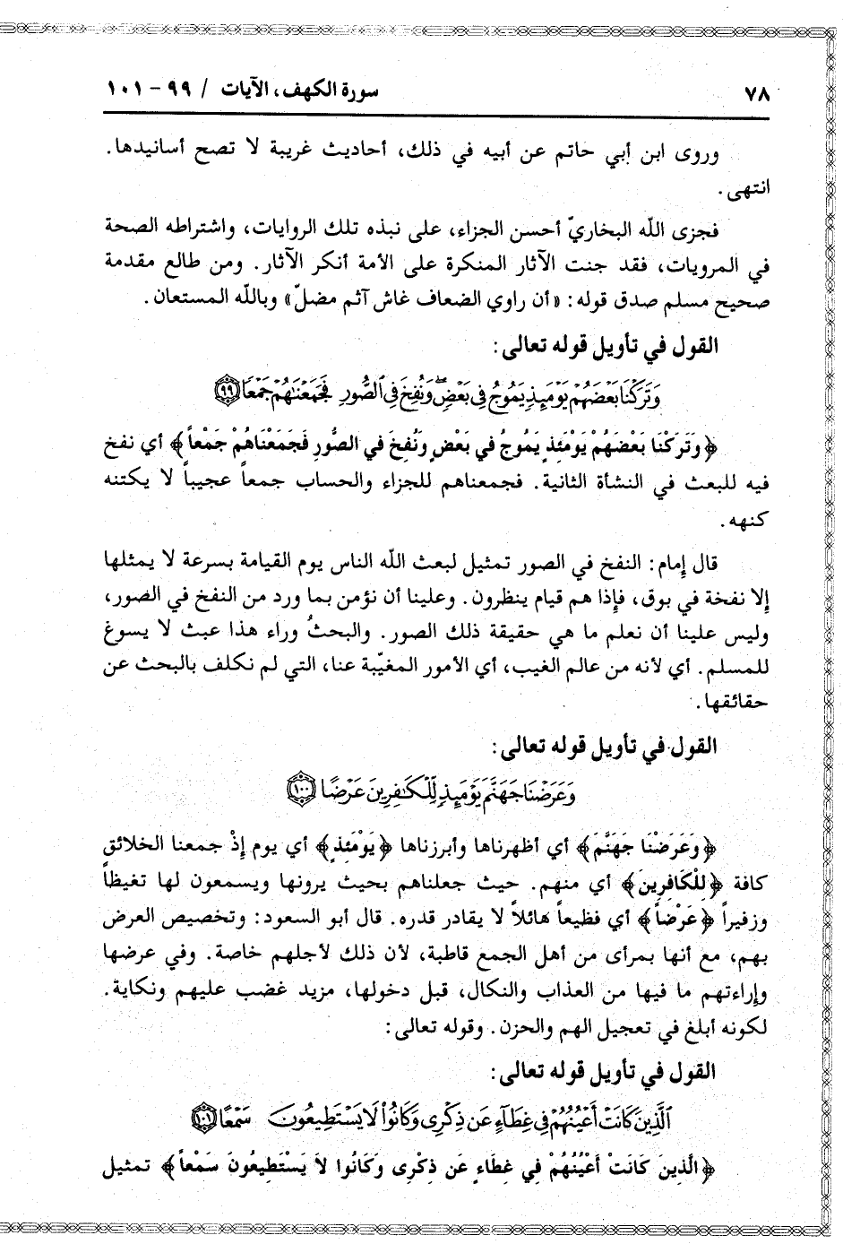 وَتَرَكْنا بَعْضَهُمْ يَوْمَئِذٍ يَمُوجُ فِي بَعْضٍ وَنُفِخَ فِي الصُّورِ فَجَمَعْناهُمْ جَمْعاً (99)