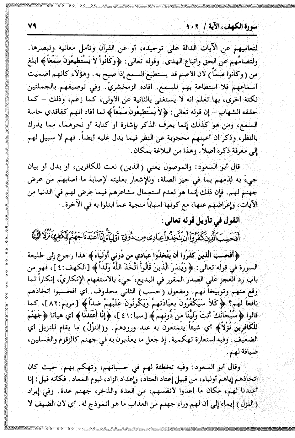 أَفَحَسِبَ الَّذِينَ كَفَرُوا أَنْ يَتَّخِذُوا عِبادِي مِنْ دُونِي أَوْلِياءَ إِنَّا أَعْتَدْنا جَهَنَّمَ لِلْكافِرِينَ نُزُلاً (102)