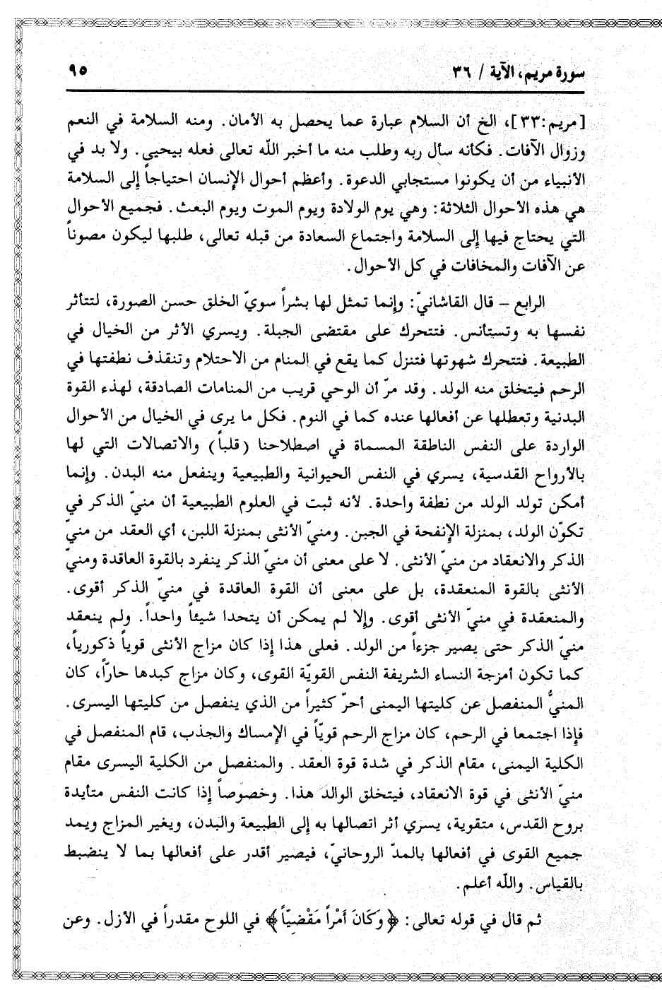 الرابع- قال القاشانيّ: وإنما تمثل لها بشرا سويّ الخلق حسن الصورة، لتتأثر نفسها به وتستأنس. فتتحرك على مقتضى الجبلة. ويسري الأثر من الخيال في الطبيعة. فتتحرك شهوتها فتنزل كما يقع في المنام من الاحتلام وتنقذف نطفتها في الرحم فيتخلق منه الولد. وقد مرّ أن الوحي قريب من المنامات الصادقة، لهذه القوة البدنية وتعطلها عن أفعالها عنده كما في النوم. فكل ما يرى في الخيال من الأحوال الواردة على النفس الناطقة المسماة في اصطلاحنا (قلبا) والاتصالات التي لها بالأرواح القدسية، يسري في النفس الحيوانية والطبيعية وينفعل منه البدن. وإنما أمكن تولد الولد من نطفة واحدة. لأنه ثبت في العلوم الطبيعية أن منيّ الذكر في تكوّن الولد، بمنزلة الإنفحة في الجبن. ومنيّ الأنثى بمنزلة اللبن، أي العقد من منيّ الذكر والانعقاد من منيّ الأنثى. لا على معنى أن منيّ الذكر ينفرد بالقوة العاقد ومنيّ الأنثى بالقوة المنعقدة، بل على معنى أن القوة العاقدة في منيّ الذكر أقوى.