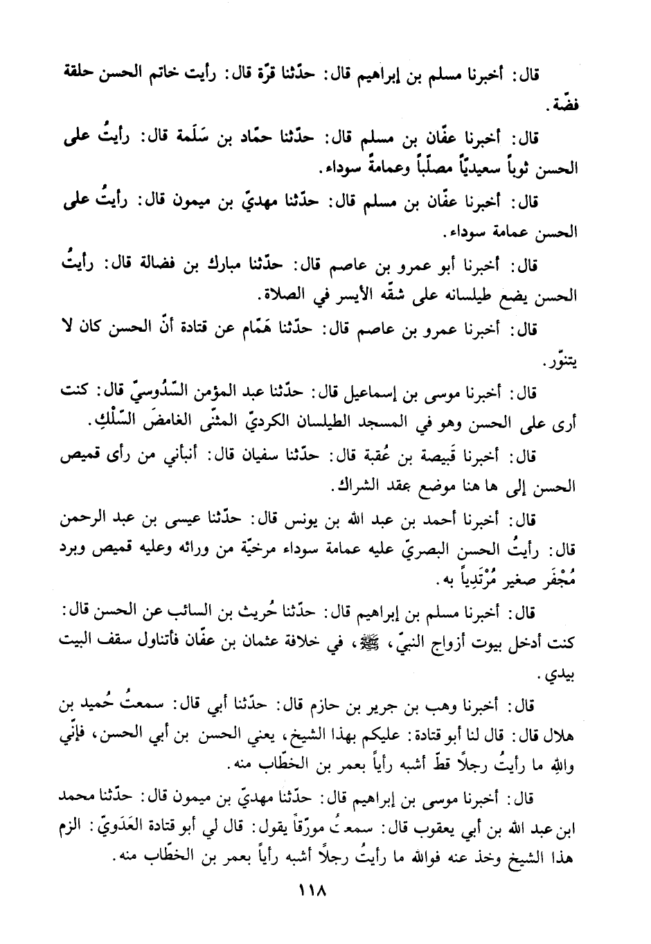 قَالَ: أَخْبَرَنَا عَفَّانُ بْنُ مُسْلِمٍ قَالَ: حَدَّثَنَا حَمَّادُ بْنُ سَلَمَةَ قَالَ: رَأَيْتُ عَلَى الْحَسَنِ ثَوْبًا سَعِيدِيًّا مُصَلَّبًا وَعِمَامَةً سَوْدَاءَ.