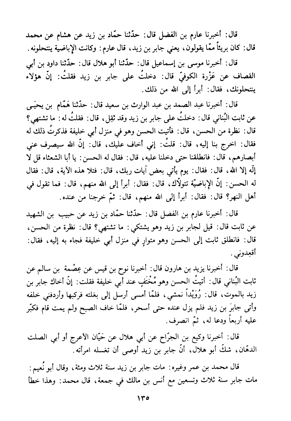 قَالَ: أَخْبَرَنَا عَارِمُ بْنُ الْفَضْلِ قَالَ: حَدَّثَنَا حَمَّادُ بْنُ زَيْدٍ عَنْ هِشَامٍ عَنْ مُحَمَّدٍ قَالَ: كَانَ بَرِيئًا مِمَّا يَقُولُونَ. يَعْنِي جَابِرَ بْنَ زَيْدٍ. قَالَ عَارِمٌ: وَكَانَتِ الإِبَاضِيَّةُ يَنْتَحِلُونَهُ.