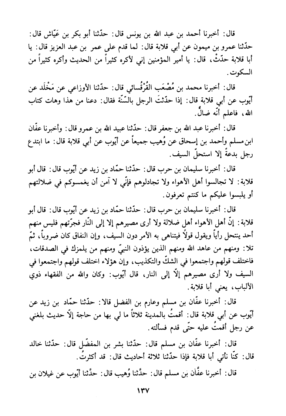 قَالَ: أَخْبَرَنَا سُلَيْمَانُ بْنُ حَرْبٍ قَالَ: حَدَّثَنَا حَمَّادُ بْنُ زَيْدٍ عَنْ أَيُّوبَ قَالَ: قَالَ أَبُو قِلابَةَ: لا تُجَالِسُوا أهل الأَهْوَاءِ وَلا تُجَادِلُوهُمْ فَإِنِّي لا آمَنُ أَنْ يَغْمِسُوكُمْ فِي ضَلالَتِهِمْ أَوْ يَلْبِسُوا عَلَيْكُمْ مَا كُنْتُمْ تَعْرِفُونَ.
