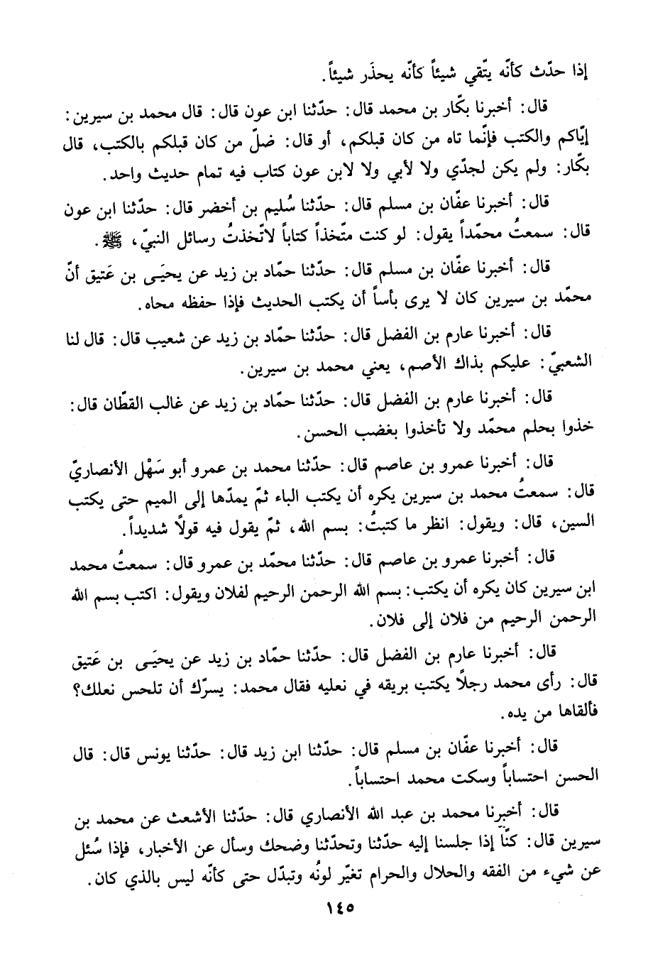 قَالَ: أَخْبَرَنَا عَفَّانُ بْنُ مُسْلِمٍ قَالَ: حَدَّثَنَا حَمَّادُ بْنُ زيد عن يَحْيَى بْنِ عَتِيقٍ أَنَّ مُحَمَّدَ بْنَ سِيرِينَ كَانَ لا يَرَى بَأْسًا أَنْ يَكْتُبَ الْحَدِيثَ فَإِذَا حَفِظَهُ مَحَاهُ.