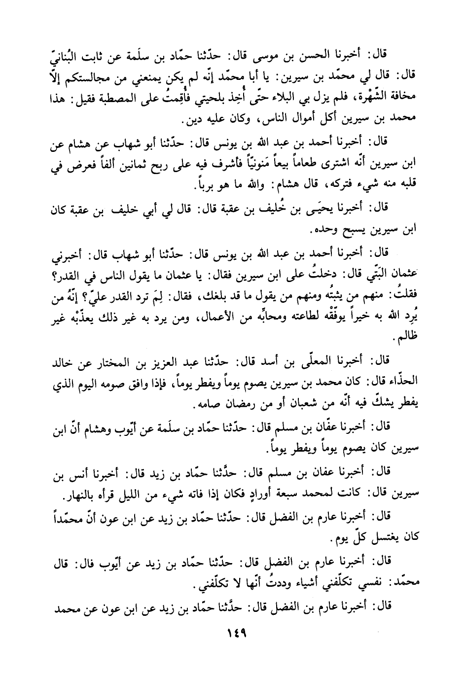 قَالَ: أَخْبَرَنَا الْحَسَنُ بْنُ مُوسَى قَالَ: حَدَّثَنَا حماد بن سلمة عن ثابت البناني قال: قَالَ لِي مُحَمَّدُ بْنُ سِيرِينَ: يَا أبا مُحَمَّدٍ إِنَّهُ لَمْ يَكُنْ يَمْنَعُنِي مِنْ مُجَالَسَتِكُمْ إِلا مَخَافَةُ الشُّهْرَةِ. فَلَمْ يَزَلْ بِي الْبَلاءُ حَتَّى أُخِذَ بِلِحْيَتِي فَأُقِمْتُ عَلَى الْمَصْطَبَةِ فَقِيلَ: هَذَا مُحَمَّدُ بْنُ سِيرِينَ أَكَلَ أَمْوَالَ النَّاسِ. وَكَانَ عَلَيْهِ دَيْنٌ.