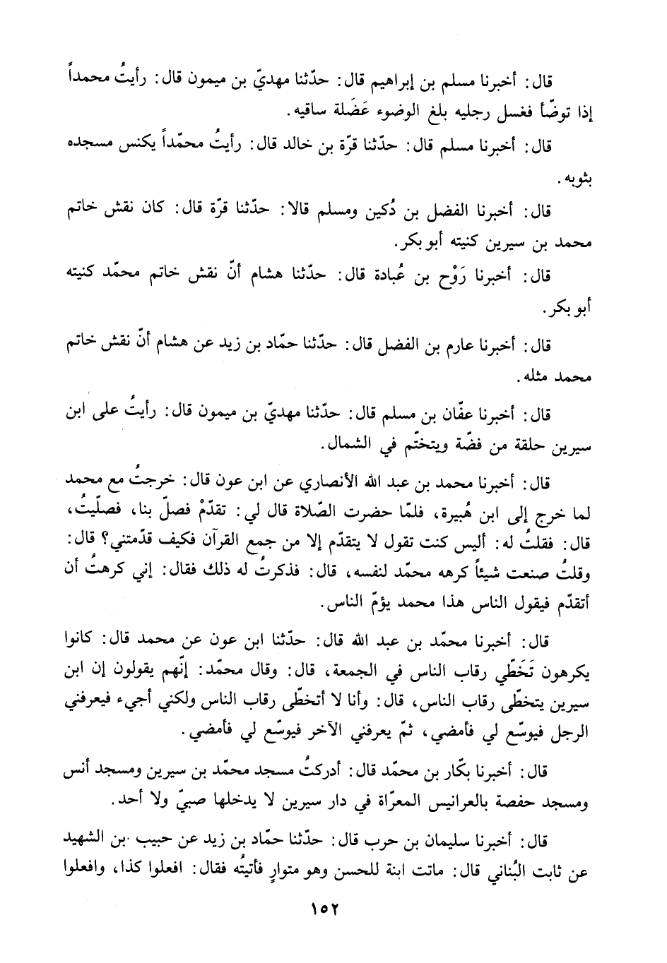 قَالَ: أَخْبَرَنَا عَفَّانُ بْنُ مُسْلِمٍ قَالَ: حَدَّثَنَا مَهْدِيُّ بْنُ مَيْمُونٍ قَالَ: رَأَيْتُ عَلَى ابْنِ سِيرِينَ حَلْقَةً مِنْ فِضَّةٍ وَيَتَخَتَّمُ فِي الشِّمَالِ.