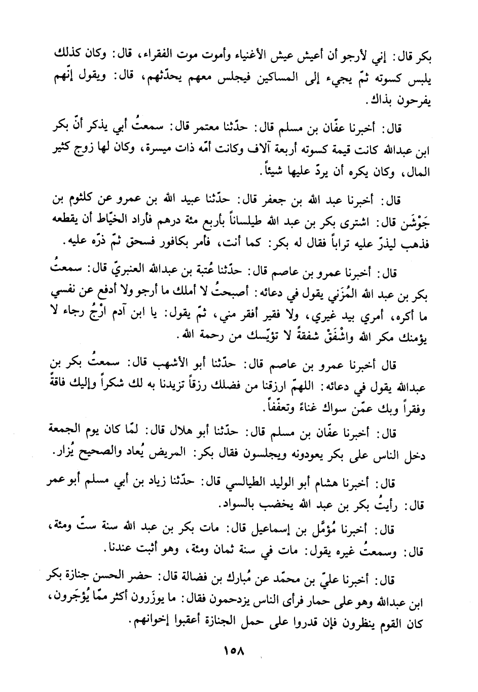 بَكْرٍ قَالَ: إِنِّي لأَرْجُو أَنْ أَعِيشَ عَيْشَ الأَغْنِيَاءِ وَأَمُوتَ مَوْتَ الْفُقَرَاءِ. قَالَ: وَكَانَ كَذَلِكَ يَلْبَسُ كِسْوَتَهُ ثُمَّ يَجِيءُ إِلَى الْمَسَاكِينِ فَيَجْلِسُ مَعَهُمْ يُحَدِّثُهُمْ. قَالَ: وَيَقُولُ إِنَّهُمْ يَفْرَحُونَ بِذَاكَ.