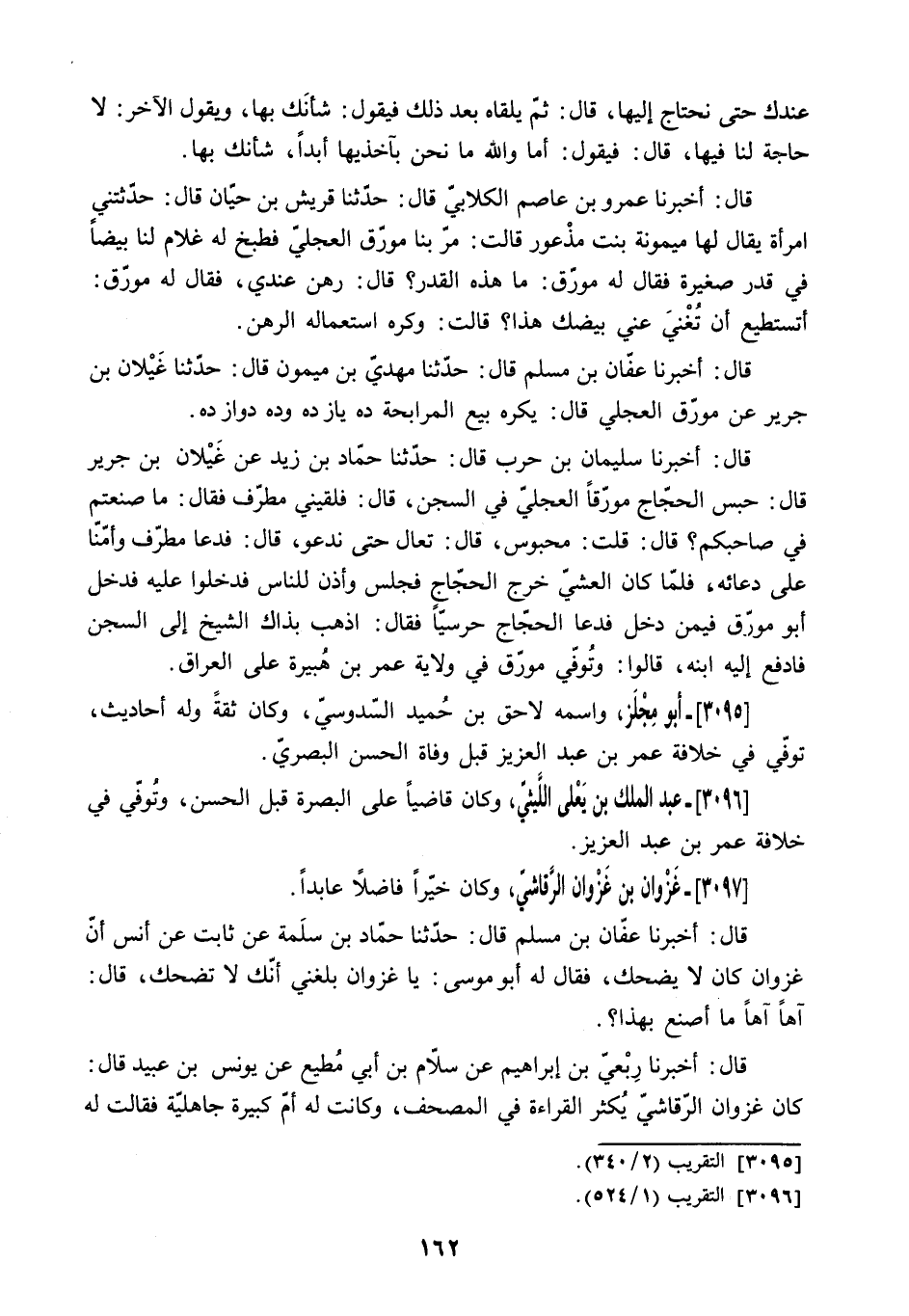 قَالَ: أَخْبَرَنَا سُلَيْمَانُ بْنُ حَرْبٍ قَالَ: حَدَّثَنَا حَمَّادُ بْنُ زَيْدٍ عَنْ غَيْلانَ بْنِ جَرِيرٍ قَالَ: حَبَسَ الْحَجَّاجُ مُوَرِّقًا الْعِجْلِيَّ فِي السِّجْنِ. قَالَ: فَلَقِيَنِي مُطَرِّفٌ فَقَالَ: مَا صَنَعْتُمْ فِي صَاحِبِكُمْ؟ قَالَ: قُلْتُ: مَحْبُوسٌ. قَالَ: تَعَالَ حَتَّى نَدْعُوَ. قَالَ: فَدَعَا مُطَرِّفٌ وَأَمَّنَّا عَلَى دُعَائِهِ. فَلَمَّا كَانَ الْعَشِيَّ خَرَجَ الْحَجَّاجُ فَجَلَسَ وَأَذِنَ لِلنَّاسِ فَدَخَلُوا عَلَيْهِ فَدَخَلَ أَبُو مُوَرِّقٍ فِيمَنْ دَخَلَ فَدَعَا الْحَجَّاجُ حَرَسِيًّا فَقَالَ: اذْهَبْ بِذَاكَ الشَّيْخِ إِلَى السِّجْنِ فَادْفَعْ إِلَيْهِ ابْنَهُ. قَالُوا: وَتُوُفِّيَ مُوَرِّقٌ فِي وِلايَةِ عُمَرَ بْنِ هُبَيْرَةَ عَلَى الْعِرَاقِ.