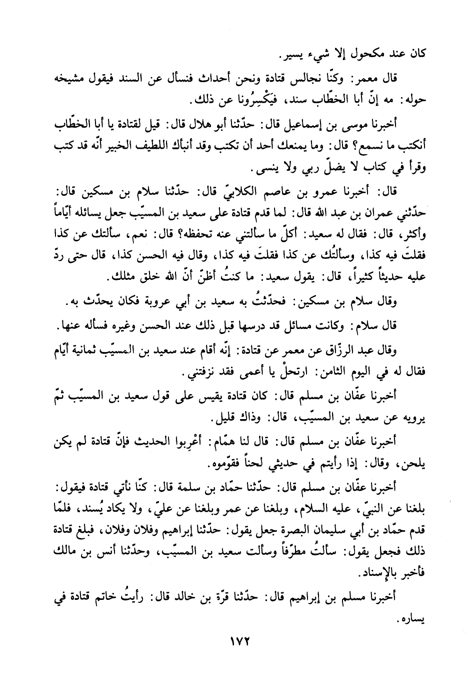 بَلَغَنَا عن النبي. ع. وَبَلَغَنَا عَنْ عُمَرَ وَبَلَغَنَا عَنْ عَلِيٍّ. وَلا يَكَاد يُسْنِدُ. فَلَمَّا قَدِمَ حَمَّادُ بْنُ أبي سُلَيْمَانَ الْبَصْرَةَ جَعَلَ يَقُولُ: حَدَّثَنَا إِبْرَاهِيمُ وَفُلانٌ وَفُلانٌ. فبلغ قتادة ذلك فجعل يَقُولُ: سَأَلْتُ مُطَرِّفًا وَسَأَلْتُ سَعِيدَ بْنَ الْمُسَيِّبِ. وَحَدَّثَنَا أَنَسُ بْنُ مَالِكٍ فَأَخْبَرَ بِالإِسْنَادِ.