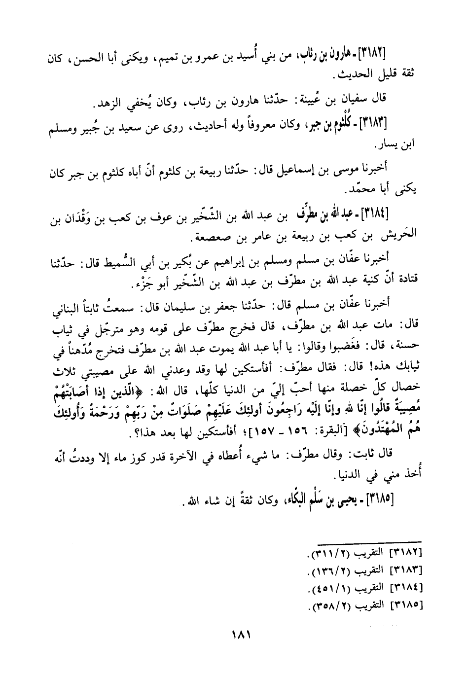 أَخْبَرَنَا عَفَّانُ بْنُ مُسْلِمٍ قَالَ: حَدَّثَنَا جَعْفَرُ بْنُ سُلَيْمَانَ قَالَ: سَمِعْتُ ثَابِتًا الْبُنَانِيَّ قَالَ: مَاتَ عَبْدُ اللَّهِ بْنُ مُطَرِّفٍ. قَالَ فَخَرَجَ مُطَرِّفٌ عَلَى قَوْمِهِ وَهُوَ مُتَرَجِّلٌ فِي ثِيَابٍ حَسَنَةٍ. قَالَ: فَغَضِبُوا وَقَالُوا: يَا أبا عَبْدِ اللَّهِ يَمُوتُ عَبْدُ اللَّهِ بْنُ مُطَرِّفٍ فَتَخْرُجُ مُدَّهِنًا فِي ثِيَابِكَ هَذِهِ! قَالَ: فَقَالَ مُطَرِّفٌ: أَفَأَسْتَكِينُ لَهَا وَقَدْ وَعَدَنِي اللَّهُ عَلَى مُصِيبَتِي ثَلاثَ خِصَالٍ كُلُّ خَصْلَةٍ مِنْهَا أَحَبُّ إِلَيَّ مِنَ الدُّنْيَا كُلِّهَا. قَالَ اللَّهُ: «الَّذِينَ إِذا أَصابَتْهُمْ مُصِيبَةٌ قالُوا إِنَّا لِلَّهِ وَإِنَّا إِلَيْهِ راجِعُونَ أُولئِكَ عَلَيْهِمْ صَلَواتٌ مِنْ رَبِّهِمْ وَرَحْمَةٌ وَأُولئِكَ هُمُ الْمُهْتَدُونَ» البقرة: 156- 157. أَفَأَسْتَكِينُ لَهَا بَعْدَ هَذَا؟.