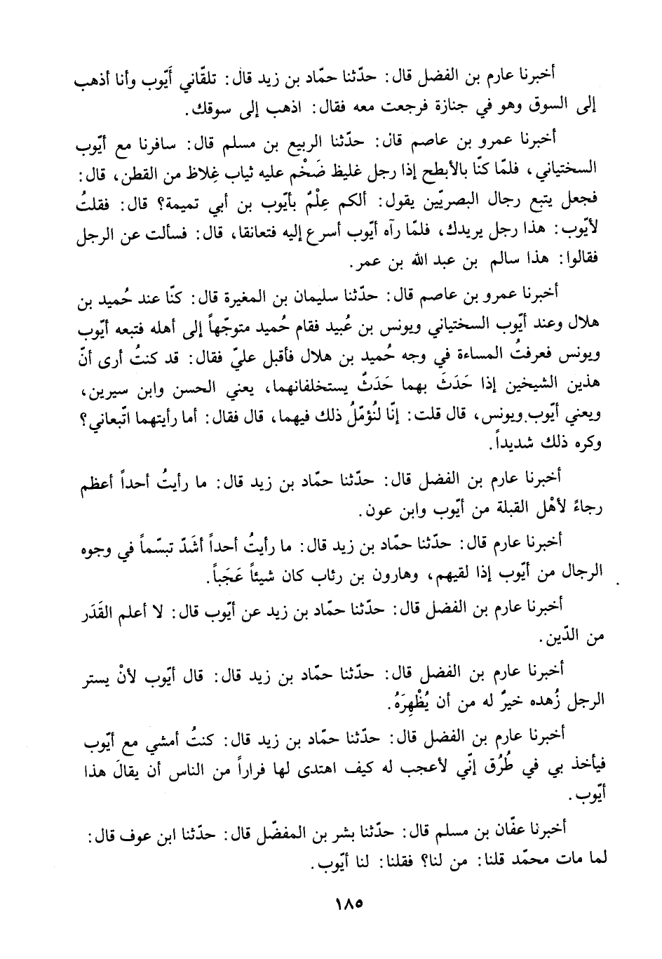 أَخْبَرَنَا عَارِمُ بْنُ الْفَضْلِ قَالَ: حَدَّثَنَا حَمَّادُ بْنُ زَيْدٍ قَالَ: كُنْتُ أَمْشِي مَعَ أَيُّوبَ فَيَأْخُذُ بِي فِي طُرُقٍ إِنِّي لأَعْجَبُ لَهُ كَيْفَ اهْتَدَى لَهَا فِرَارًا مِنَ النَّاسِ أَنْ يُقَالَ هَذَا أَيُّوبُ.