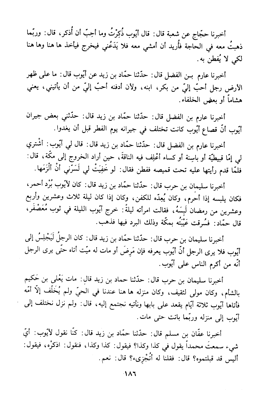 أَخْبَرَنَا سُلَيْمَانُ بْنُ حَرْبٍ قَالَ: حَدَّثَنَا حَمَّادُ بْنُ زَيْدٍ قَالَ: كَانَ الرَّجُلُ لِيَجْلِسُ إِلَى أَيُّوبَ فَلا يَرَى الرَّجُلُ أَنَّ أَيُّوبَ يَعْرِفُهُ فَإِنْ مَرِضَ أَوْ مَاتَ لَهُ مَيِّتٌ أَتَاهُ حَتَّى يَرَى الرَّجُلُ أَنَّهُ مِنْ أَكْرَمِ النَّاسِ عَلَى أَيُّوبَ.