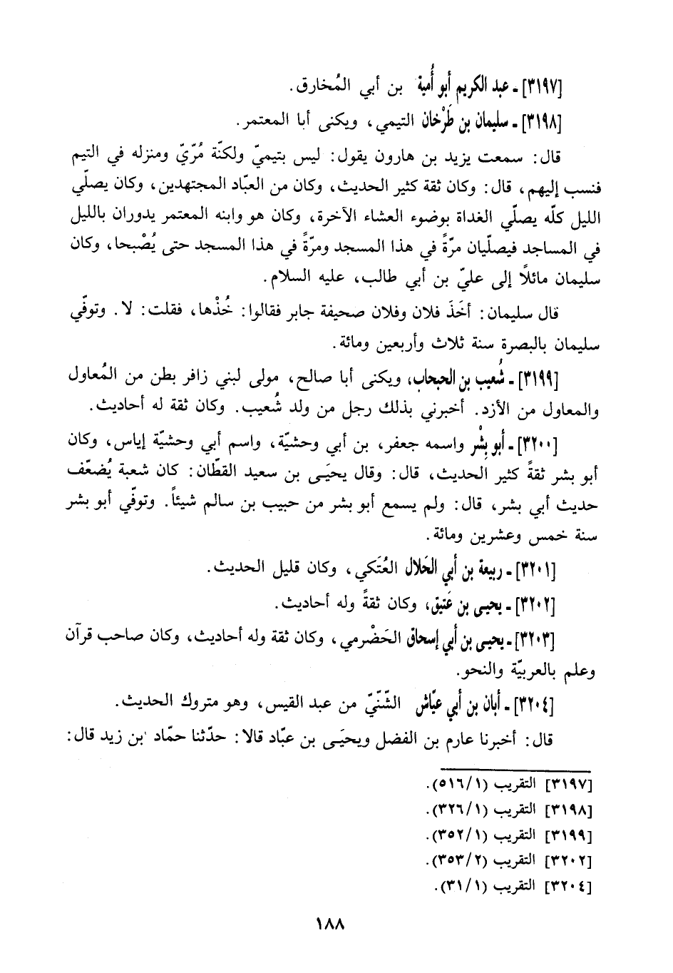 قال: سمعت يزيد بن هارون يقول: ليس بتيمي ولكنه مري ومنزله في التيم فنسب إليهم. قال: وكان ثقة كثير الحديث. وكان من العباد المجتهدين. وكان يصلي الليل كله يصلي الغداة بوضوء العشاء الآخرة. وكان هو وابنه المعتمر يدوران بالليل في المساجد فيصليان مرة في هذا المسجد ومرة في هذا المسجد حتى يصبحا. وكان سليمان مائلًا إلى علي بن أبي طالب. ع.