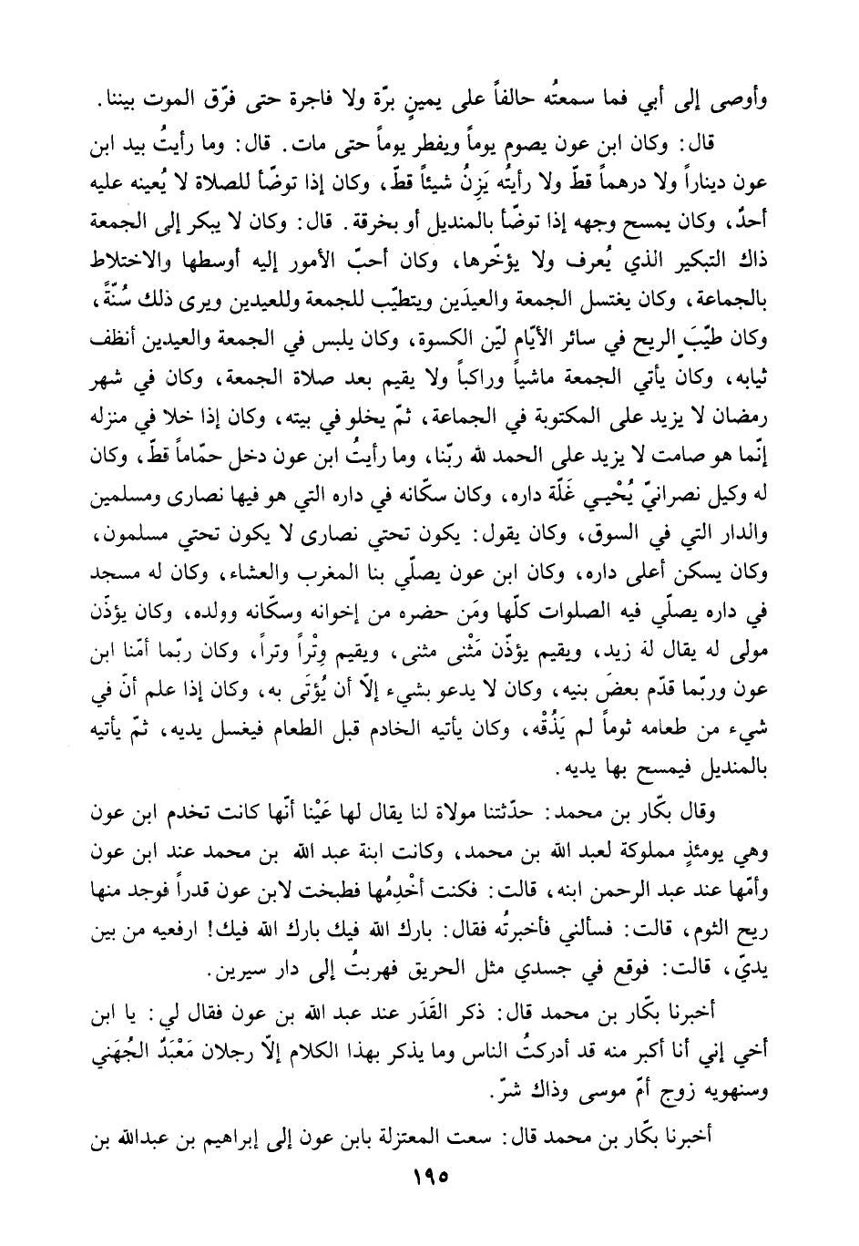 قَالَ: وَكَانَ ابْنُ عَوْنٍ يَصُومُ يَوْمًا وَيُفْطِرُ يَوْمًا حَتَّى مَاتَ. قَالَ: وَمَا رَأَيْتُ بِيَدِ ابْنِ عَوْنٍ دِينَارًا وَلا دِرْهَمًا قَطُّ وَلا رَأَيْتُهُ يَزِنُ شَيْئًا قَطُّ. وَكَانَ إِذَا تَوَضَّأَ لِلصَّلاةِ لا يُعِينُهُ عَلَيْهِ أَحَدٌ. وَكَانَ يَمْسَحُ وَجْهَهُ إِذَا تَوَضَّأَ بِالْمِنْدِيلِ أَوْ بِخِرْقَةٍ. قَالَ: وَكَانَ لا يُبَكِّرُ إِلَى الْجُمُعَةِ ذَاكَ التَّبْكِيرَ الَّذِي يُعْرَفُ وَلا يُؤَخِّرُهَا. وَكَانَ أَحَبَّ الأُمُورِ إِلَيْهِ أَوْسَطُهَا وَالاخْتِلاطُ بِالْجَمَاعَةِ. وَكَانَ يَغْتَسِلُ الجمعة والعيدين ويتطيب للجمعة وللعيدين وَيَرَى ذَلِكَ سُنَّةً.