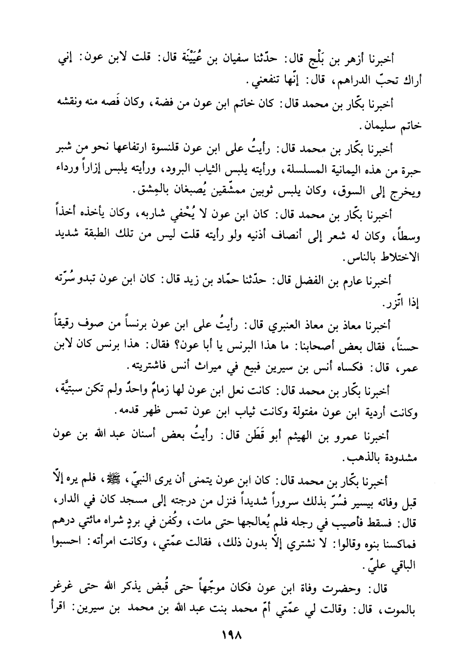 أَخْبَرَنَا مُعَاذُ بْنُ مُعَاذٍ الْعَنْبَرِيُّ قَالَ: رَأَيْتُ عَلَى ابْنِ عَوْنٍ بُرْنُسًا مِنْ صُوفٍ رَقِيقًا حَسَنًا. فَقَالَ بَعْضُ أَصْحَابِنَا: مَا هَذَا الْبُرْنُسُ يَا أبا عَوْنٍ؟ فَقَالَ: هَذَا بُرْنُسٌ كَانَ لابْنِ عُمَرَ. قَالَ: فَكَسَاهُ أَنَسَ بْنَ سِيرِينَ فَبِيعَ فِي مِيرَاثِ أَنَسٍ فَاشْتَرَيْتُهُ.