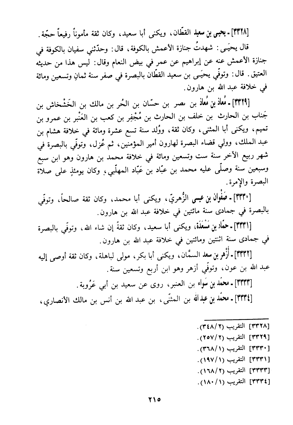 قال يحيى: شهدت جنازة الأعمش بالكوفة. قال: وحدثني سفيان بالكوفة في جنازة الأعمش عنه عن إبراهيم عن عمر في بيض النعام وقال: ليس هذا من حديثه العتيق. قال: وتوفي يحيى بن سعيد القطان بالبصرة في صفر سنة ثمان وتسعين ومائة في خلافة عبد الله بن هارون.