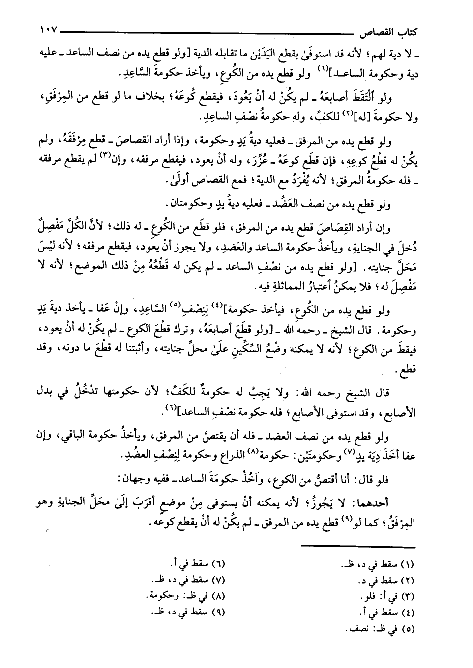 وإن أراد القصاص قطع يده من المرفق، فلو قطع من الكوع - له ذلك؛ لأن الكل مفصل دخل في الجناية، ويأخذ حكومة الساعد والعضد، ولا يجوز أن يعود، فيقطع مرفقه؛ لأنه ليس محل جنايته. [ولو قطع يده من نصف الساعد - لم يكن له قطعه من ذلك الموضع؛ لأنه لا مفصل له؛ فلا يمكن اعتبار المماثلة فيه.