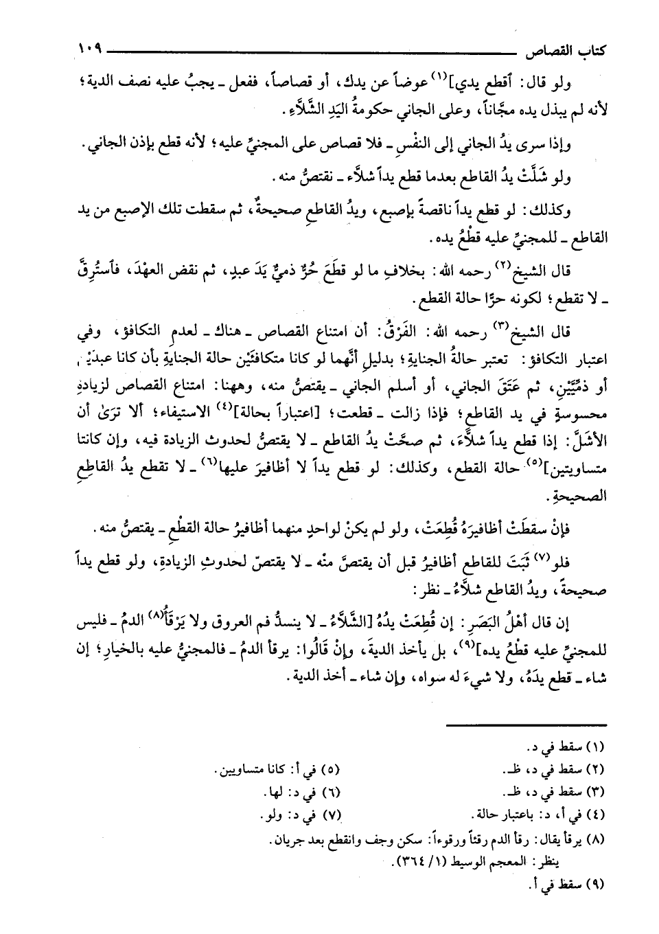 قال الشيخ رحمه الله: الفرق: أن امتناع القصاص - هناك- لعدم التكافؤ، وفي اعتبار التكافؤ: تعتبر حالة الجناية؛ بدليل أنهما لو كانا متكافئين حالة الجناية بأن كانا عبدين أو ذميين، ثم عتق الجاني، أو أسلم الجاني - يقتص منه، وههنا: امتناع القصاص لزيادة محسوسة في يد القاطع؛ فإذا زالت - قطعت؛ [اعتباراً بحالة] الاستيفاء؛ ألا ترى أن الأشل: إذا قطع يداً شلاء، ثم صحت يد القاطع - لا يقتص لحدوث الزيادة فيه، وإن كانتا متساويتين] حالة القطع، وكذلك: لو قطع يداً لا أظافير عليها - لا تقطع يدُ القاطع الصحيحة.