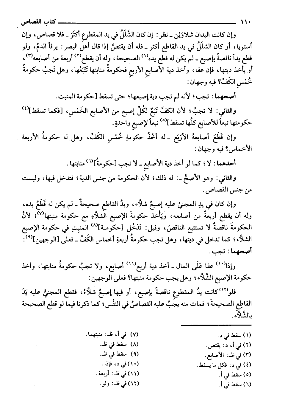 وإن كانت اليدان شلاوين - نظر: إن كان الشلل في المقطوع أكثر - فلا قصاص، وإن استويا، أو كان الشلل في يد القاطع أكثر - فله أن يقتص إذا قال أهل البصر: يرقأ الدم، ولو قطع يداً ناقصة بإصبع- لم يكن له قطع يده الصحيحة، وله أن يقطع أربعة من أصابعه، أو يأخذ ديتها، فإن عفا، وأخذ دية الأصابع الأربع فحومةُ منابتها تتبعها، وهل تجب حكومة خُمسِ الكف؟ فيه وجهان: