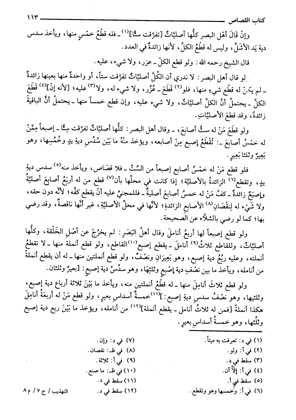 فلو قطع من له خمس أصابع إصبعاً من الست - فلا قصاص، ويأخذ منه سدس دية يدٍ، وتقطع الزائدة بالأصلية؛ إذا كانت في محلها بأن قطع من له أربع أصابع أصلية وإصبعٌ زائدةٌ -كف من له خمس أصابع أصلية- فللمجني عليه أن يقطع كفه؛ لأنه دون حقه، ولا شيء له لنقصان الأصابع الزائدة؛ لأنها في محل الأصلية، غير أنها ناقصة، وقد رضي بها؛ كما لو رضي بالشلاء عن الصحيحة.